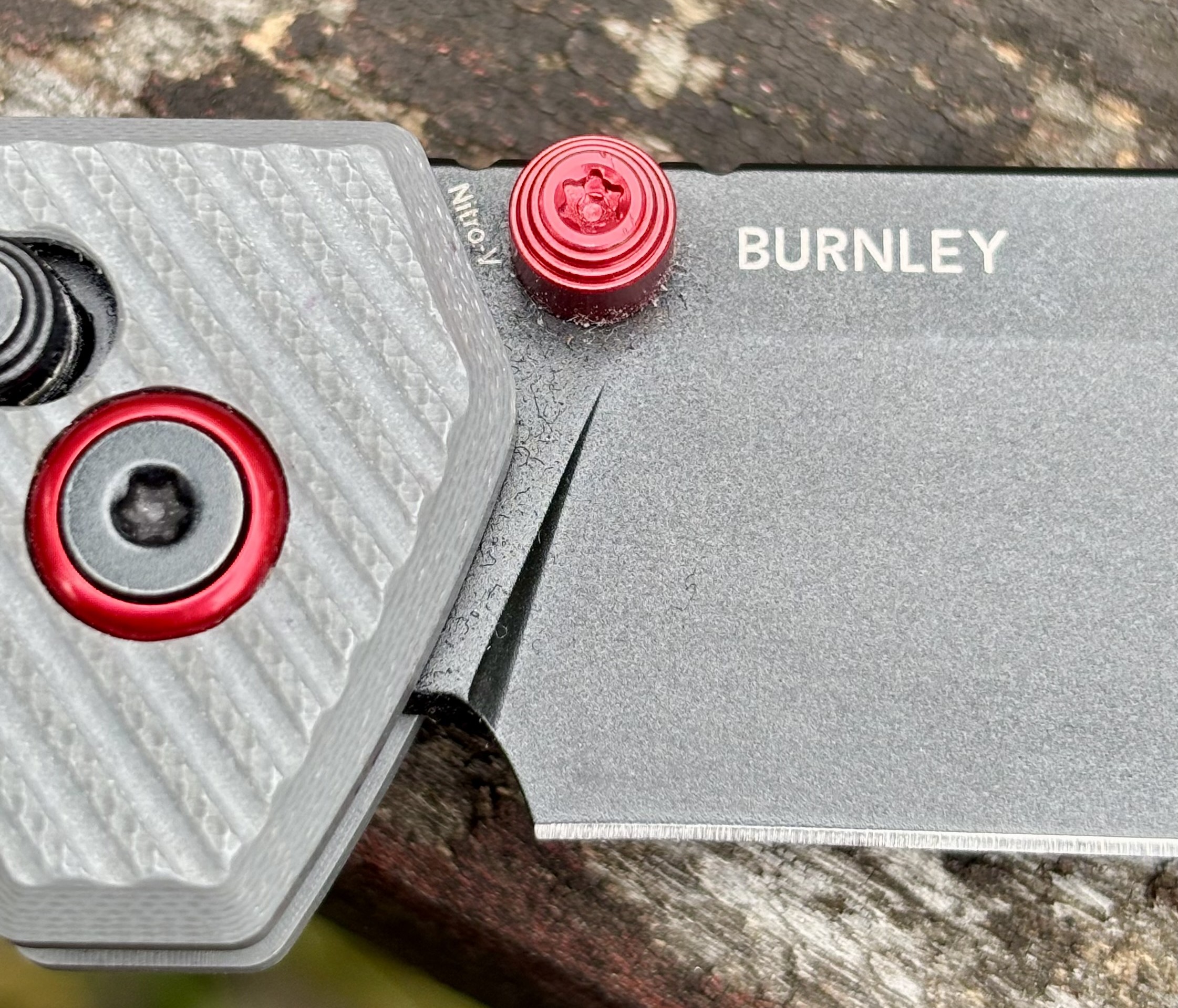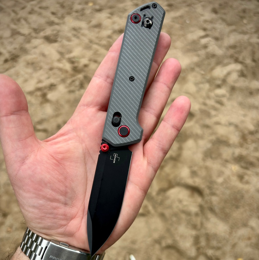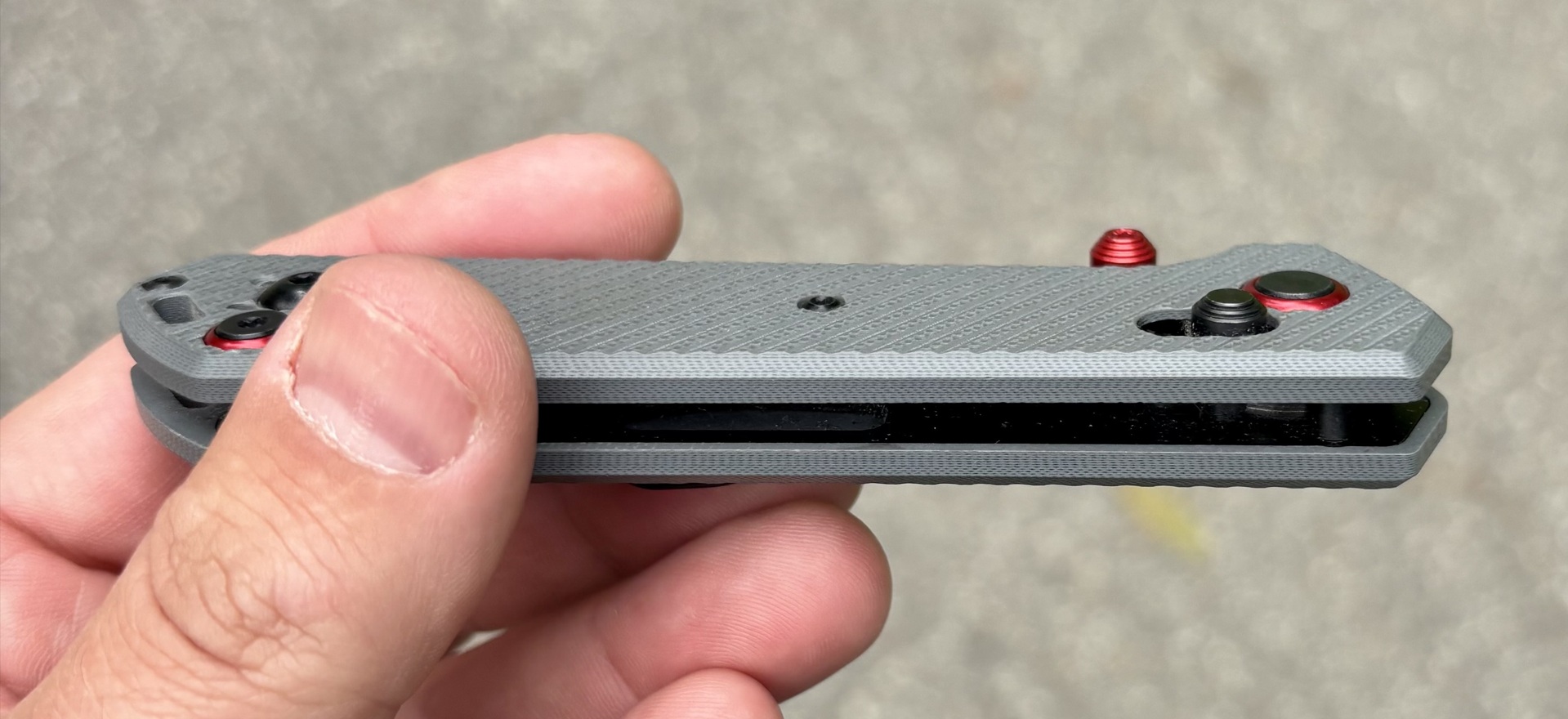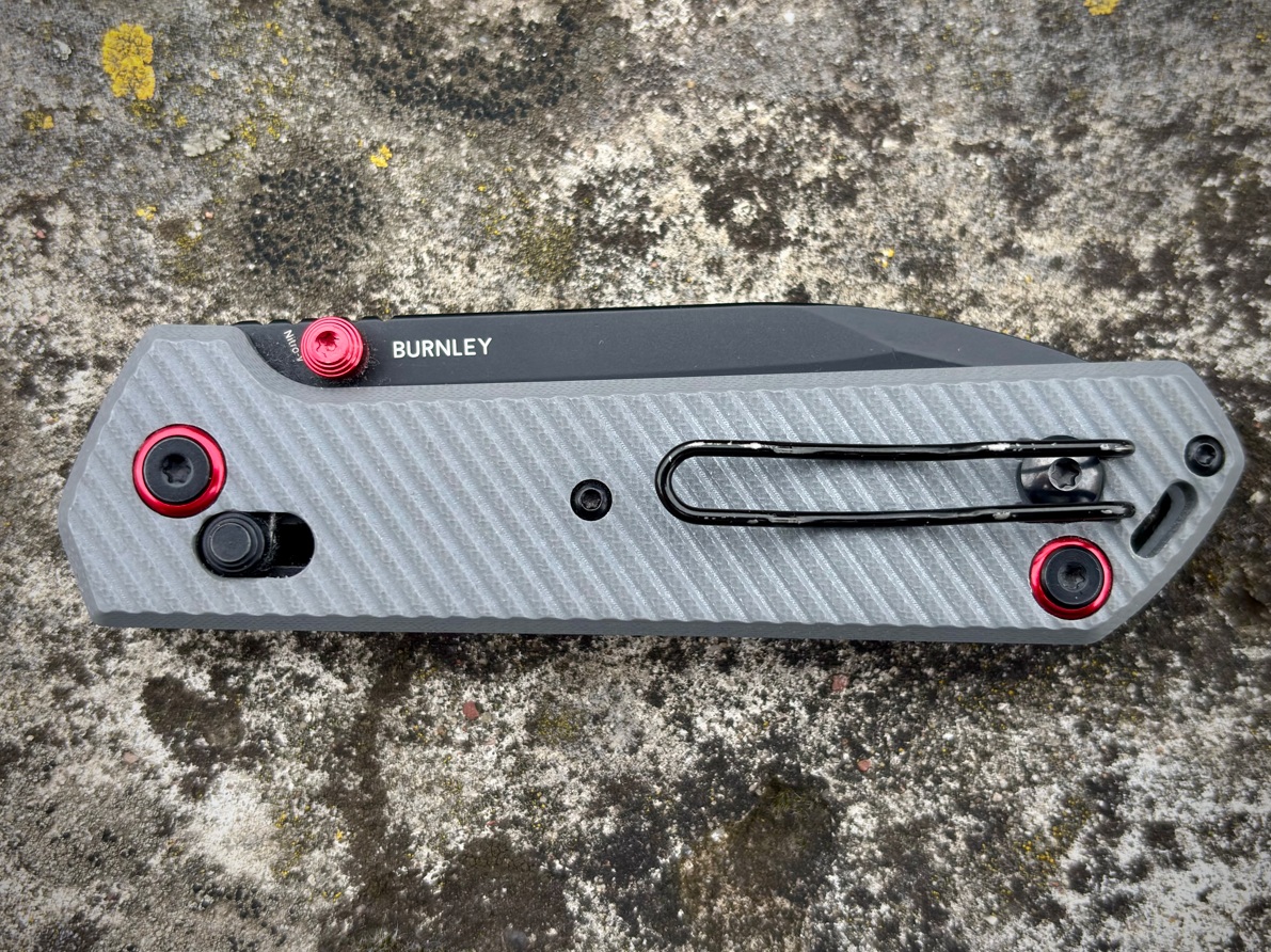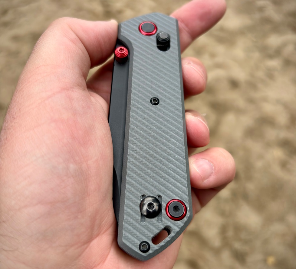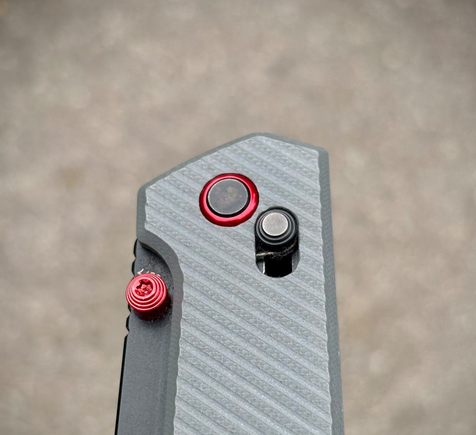 Grey G10 o diagonalnej fakturze łapie dłoń pewnie, ale nie „zjada” kieszeni. Profil nie udaje noża taktycznego – to czyste EDC: delikatne wybranie pod palec wskazujący, neutralny łuk grzbietu, brak agresywnych ramp i zadziorów. W realu działa to lepiej niż na zdjęciach – w chwycie młotkowym i pinch-grip palce naturalnie lądują tam, gdzie trzeba. Do tego odchudzone linery zmniejszają wagę bez utraty sztywności. Czerwone detale (kołki, ringi śrub) nie są krzykliwe, ale robią „podpis” edycji.