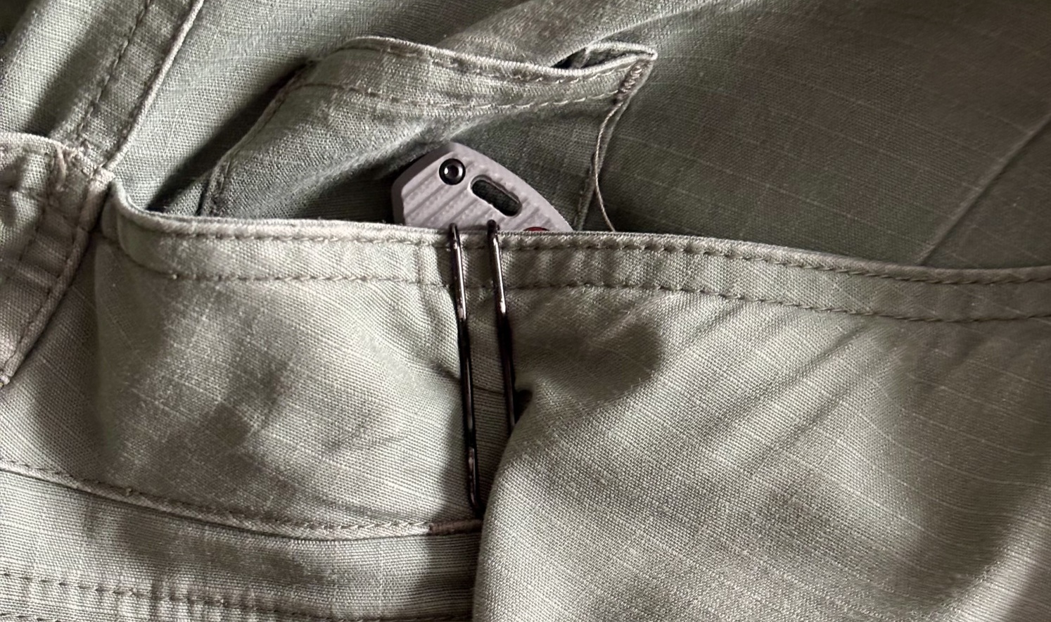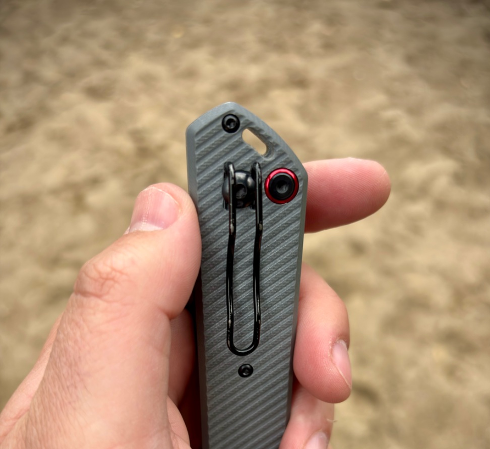 - Noszenie – 8 godzin w dżinsach i spodniach cargo. Klips nie „gryzie” pod pasem bezpieczeństwa w kieszeni cargo nie ma efektu „telepania”, bo masa ~95 g w pełnowymiarowym obrysie rozkłada się równo. Po kilku dniach kieszeń nie jest „wydarta” – faktura G10 nie jest agresywna.