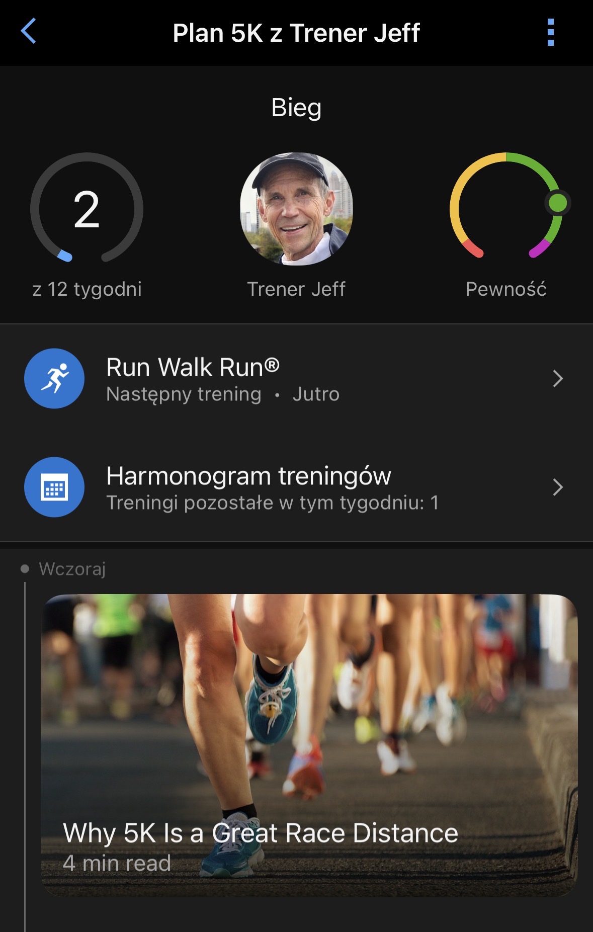 Mój wybrany plan to ‘5k z trenerem Jeffem’, charakteryzujący się właśnie wplataniem marszu w bieg. Nie do końca spełnia to moje wyidealizowane plany, ale rozsądek wygrał – to może być metoda, która ułatwi mi rozpoczęcie treningów biegowych w ogóle. Umówiłam się z aplikacją, że będę ćwiczyć 3x w tygodniu, staram się też spełniać jej założenia – nawet, jeśli ich nie rozumiem.