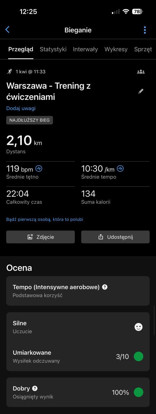 Odpaliłam, wybrałam plan, podałam niezbędne dane i postanowiłam spróbować. Na pierwszy raz zlecił mi ‘bieg wzorcowy’, czyli 5 minutowy bieg z maksymalną prędkością.