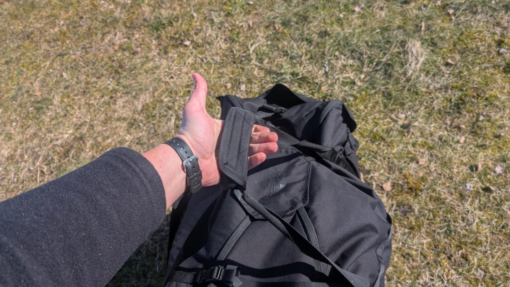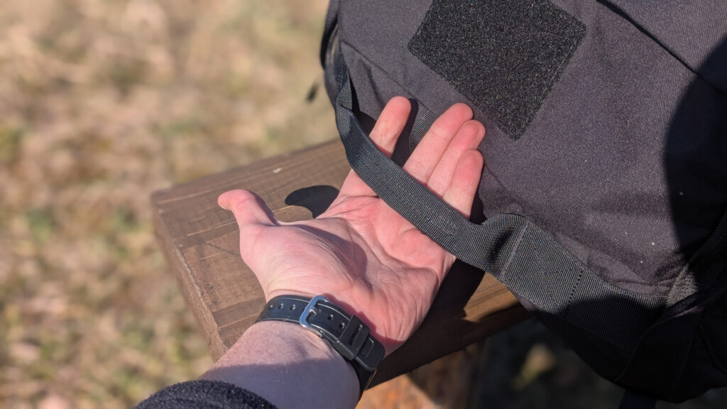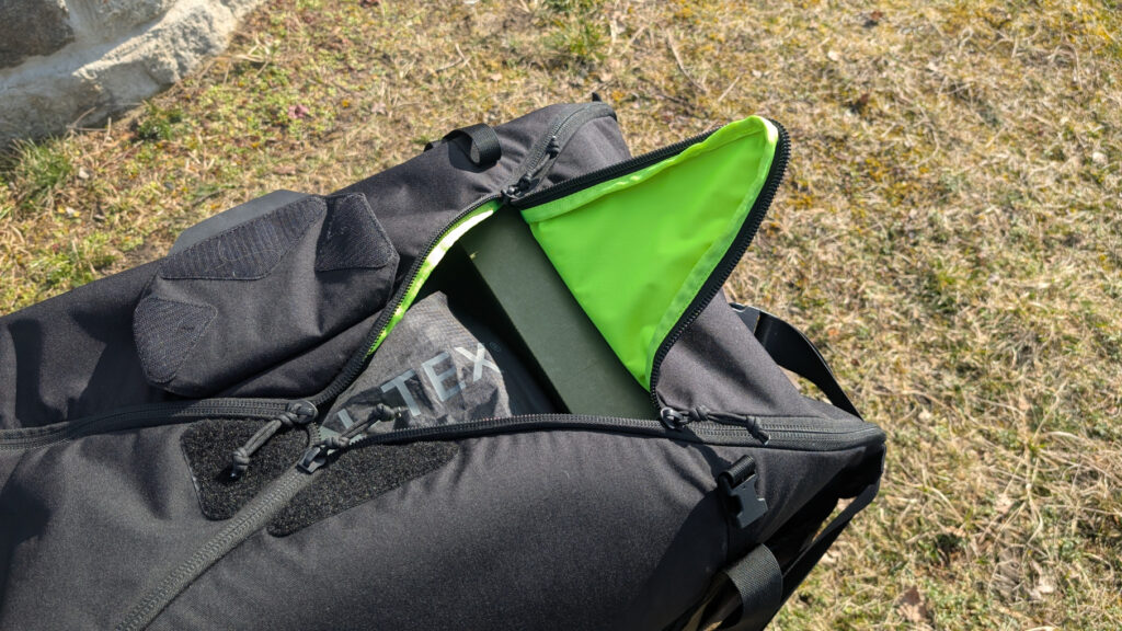 Na krótszych bokach znajdziemy porządne, szerokie i stosunkowo sztywne uchwyty pomagające w załadunku. Mogłyby być umieszczone wyżej przy krawędzi. Byłyby wygodniejsze kiedy musielibyśmy np. odstawić na bok częściowo załadowaną torbę przy rozpiętym chwycie głównym. Kwestia drobna, ale dała się trochę we znaki 🙂