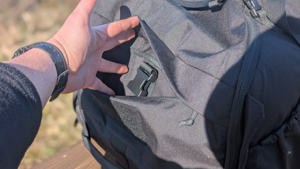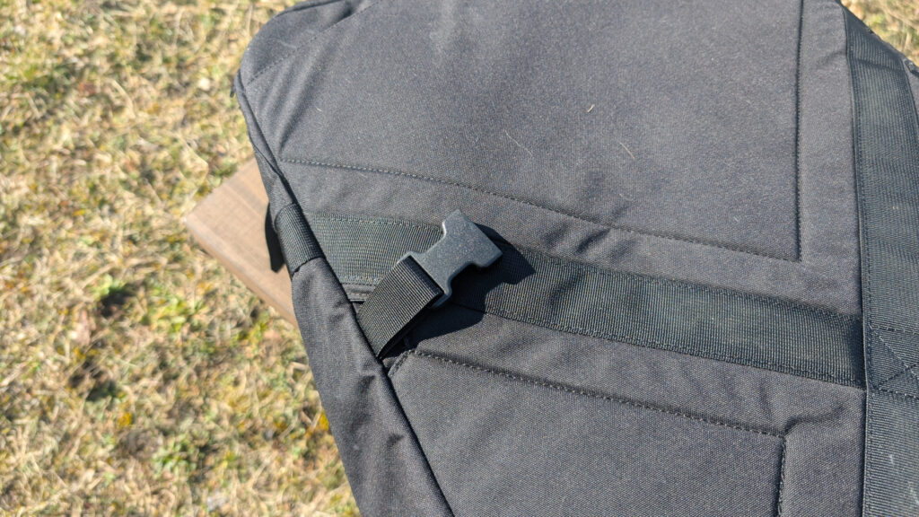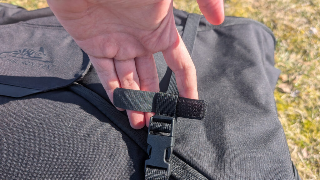 W tym samym miejscu umieszczono kieszenie mieszczące… klamry pasa naramiennego. Rozwiązanie dobre, ponieważ pas — kiedy nie jest potrzebny — może zostać odpięty i schowany do jednej z tych kieszeni. Chowają się również klamry, dzięki czemu nie dyndają i nie są narażone na uszkodzenie w trakcie transportu. No i po schowaniu pasa zyskujemy dwie dodatkowe kieszenie o nie takiej małej pojemności.