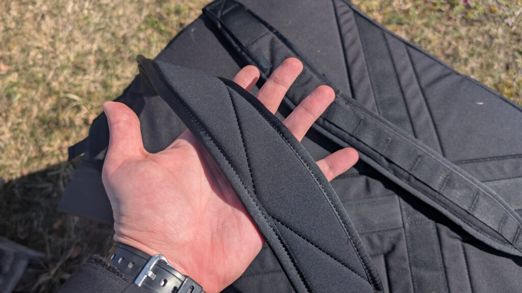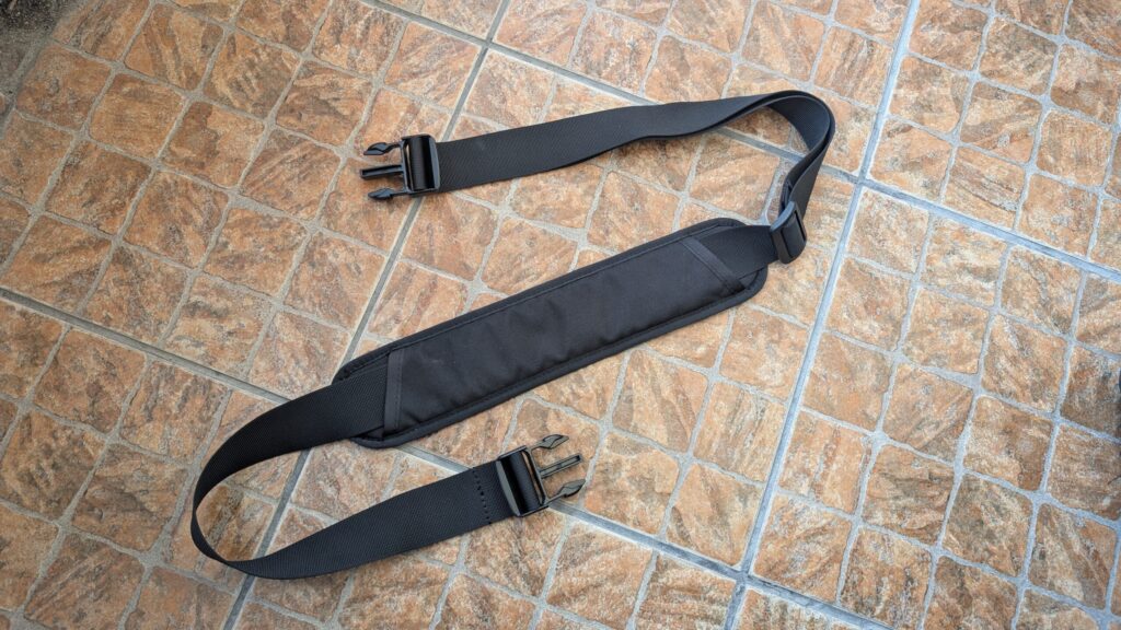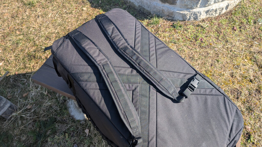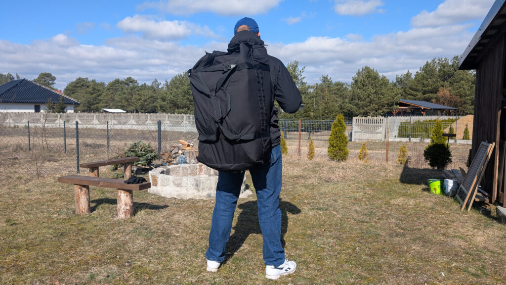 Mimo jej wielkości przenoszenie na ramieniu i plecach nie jest w większości przypadków problemem — głównie za sprawą wysokiej jakości pasków i szelek. Nic się w sumie nie wpina, szerokie comfort pady dobrze roznoszą ciężar na ramionach.