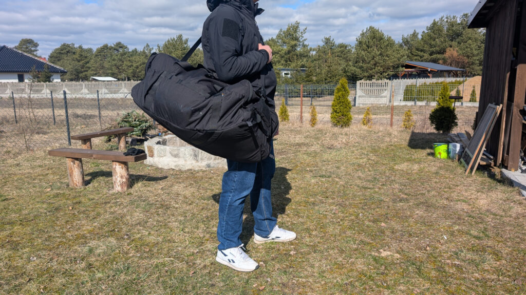 Wpierw należy zwrócić uwagę na same wymiary torby. W tabeli na początku recenzji podałem 90 x 40 x 30 cm. Podchodźcie jednak do tych wymiarów z dozą dystansu, gdyż dość ciężko je zmierzyć. Np. wysokość zależna będzie od miejsca pomiaru i stopnia naładowania. Przyjmijmy, że jest po prostu DUŻA.