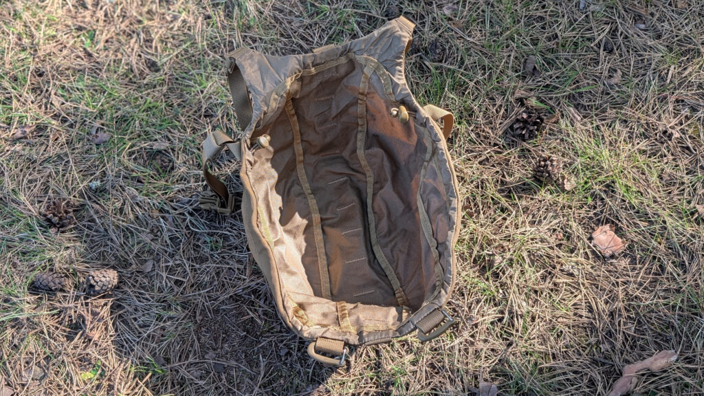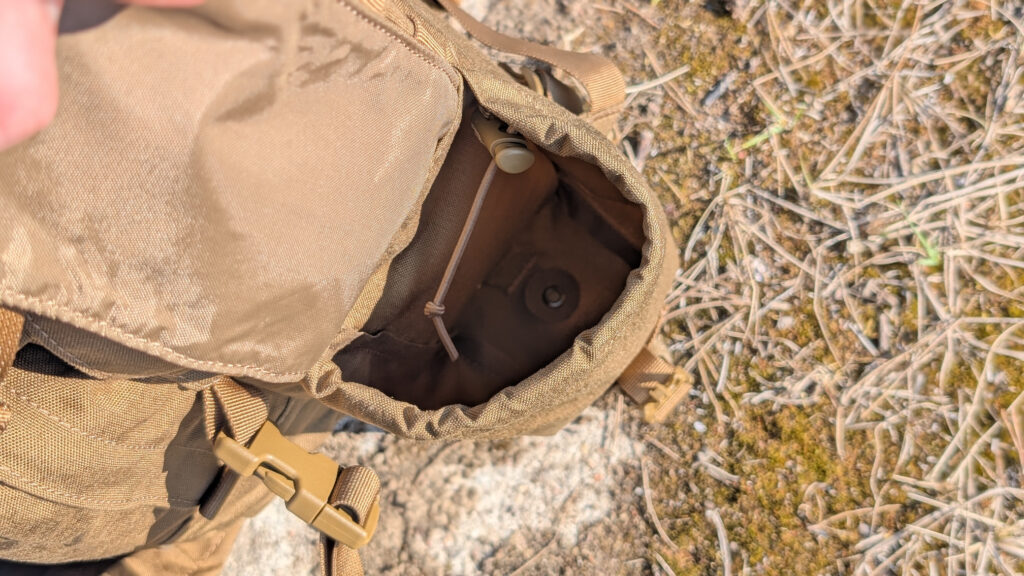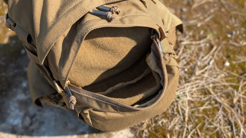 Plecaki tej wielkości z pewnością będą wykorzystywane w zastosowaniu militarnym jako plecaki hydracyjne, mieszczące bukłak z wodą. I tutaj pojawia się problem. W środku brak przegrody, do której wsuwa się bukłak. Owego braku nie jestem w stanie zrozumieć, gdyż taki rękaw znajduje się w wielu, wielu innych plecakach — także tych Helikonowych. Obecny jest wieszak na bukłak i otwór do przeprowadzenia rurki, ale brakuje rękawa. Trochę dziwna decyzja projektantów.