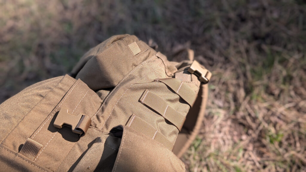 Tutaj trochę ponarzekam. Pamiętam, jak podczas premiery plecaka w sklepie internetowym Helikon-Tex, znalazło się kilku internautów narzekających na brak wyłożenia pleców plecaka. Co prawda czuć, że w plecach Ambush’a znajduje się jakaś gąbka, ale, tak czy inaczej, nasze plecy stykają się z całkowicie płaską powierzchnią z Cordury.