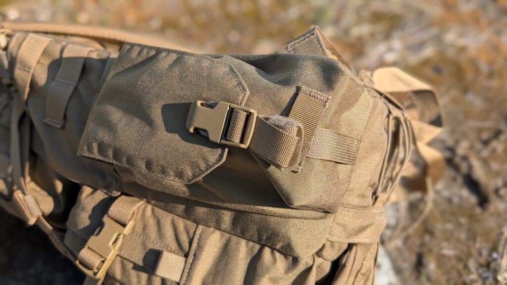 Przejdę zatem do opinii na temat reszty zewnętrznej strony plecaka. Jedną z najważniejszych cech Ambush’a jest zintegrowany, a zarazem demontowalny beavertail (ang. bobrzy ogon). Jest to swojego rodzaju noszak zewnętrzny, który umożliwia przenoszenie dodatkowego ładunku na zewnątrz plecaka. W przypadku opisywanego plecaka noszak ten zaprojektowany został z myślą o przenoszeniu hełmu.