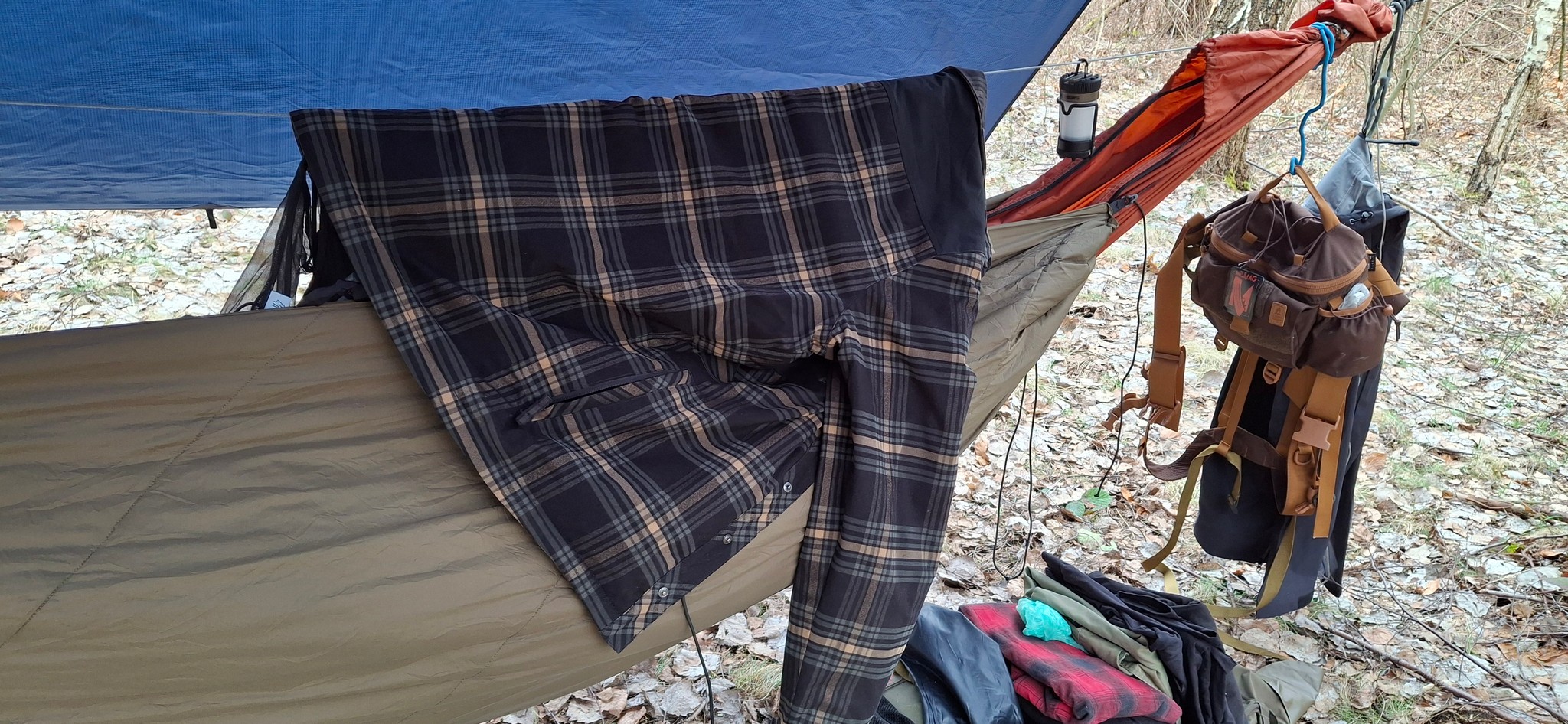 Znalazłem też dla niego zupełnie niespodziewane zastosowanie w postaci mini namiociku na cięciwie hamaka. Pomogło to utrzymać nieco wyższą temperaturę wokół twarzy, kiedy biwakowałem przy temperaturze minus jeden stopnień i Swagman był zajęty uzupełnianiem śpiwora. Relatywnie miękkie materiały z których wykonana jest ta ocieplana koszula, kwalifikują ją też do roli improwizowanej poduszki obozowej. Temperatury w jakich używałem Wardena, to mniej więcej zakres między minus 5 a plus 10 stopni Celsjusza. Przy dwunastu czy czternastu stopniach nadal jednak jest przydatny, jeżeli ktoś lubi ubierać się lekko. Łączy w sobie cechy koszuli i przejściowej kurtki, więc przy wyższych temperaturach, po prostu zakładam go wprost na t-shirt.