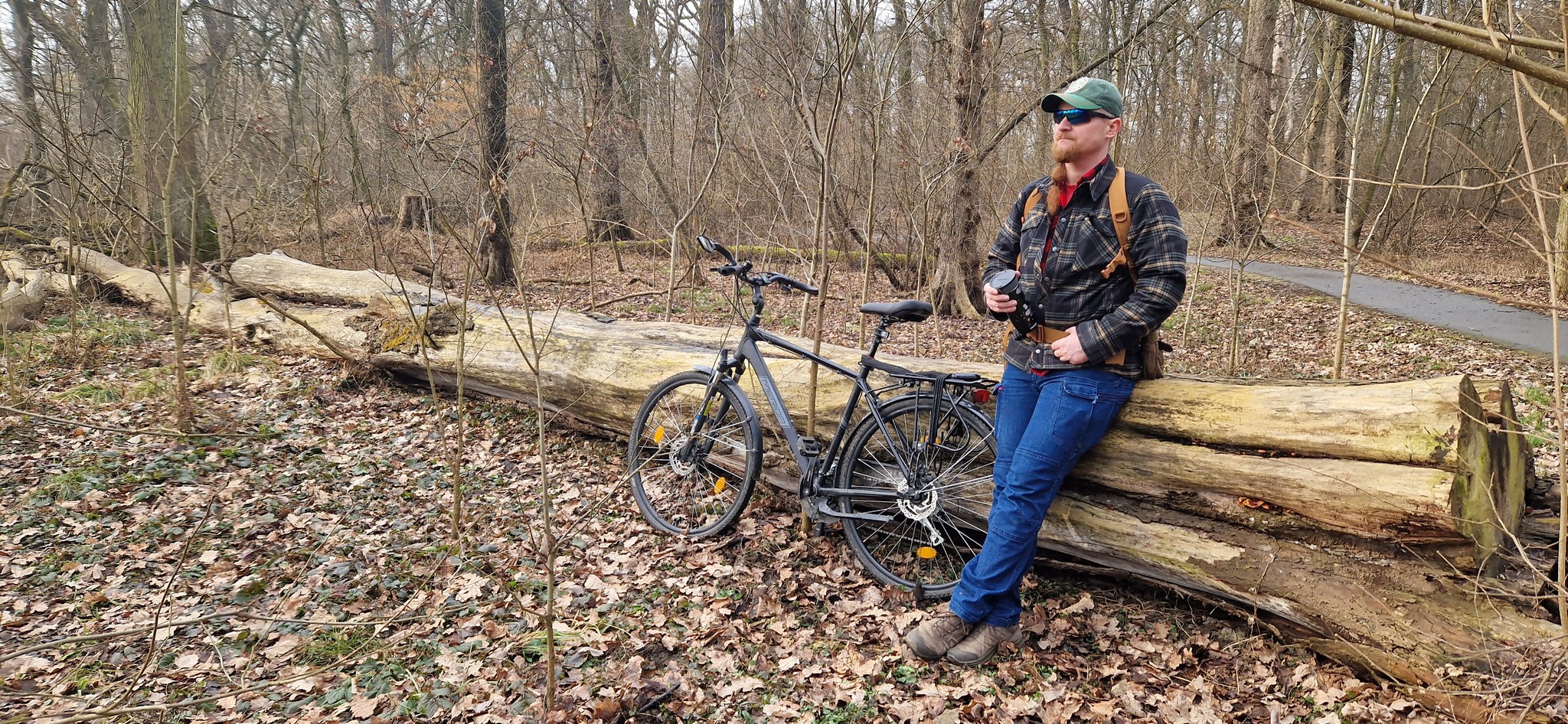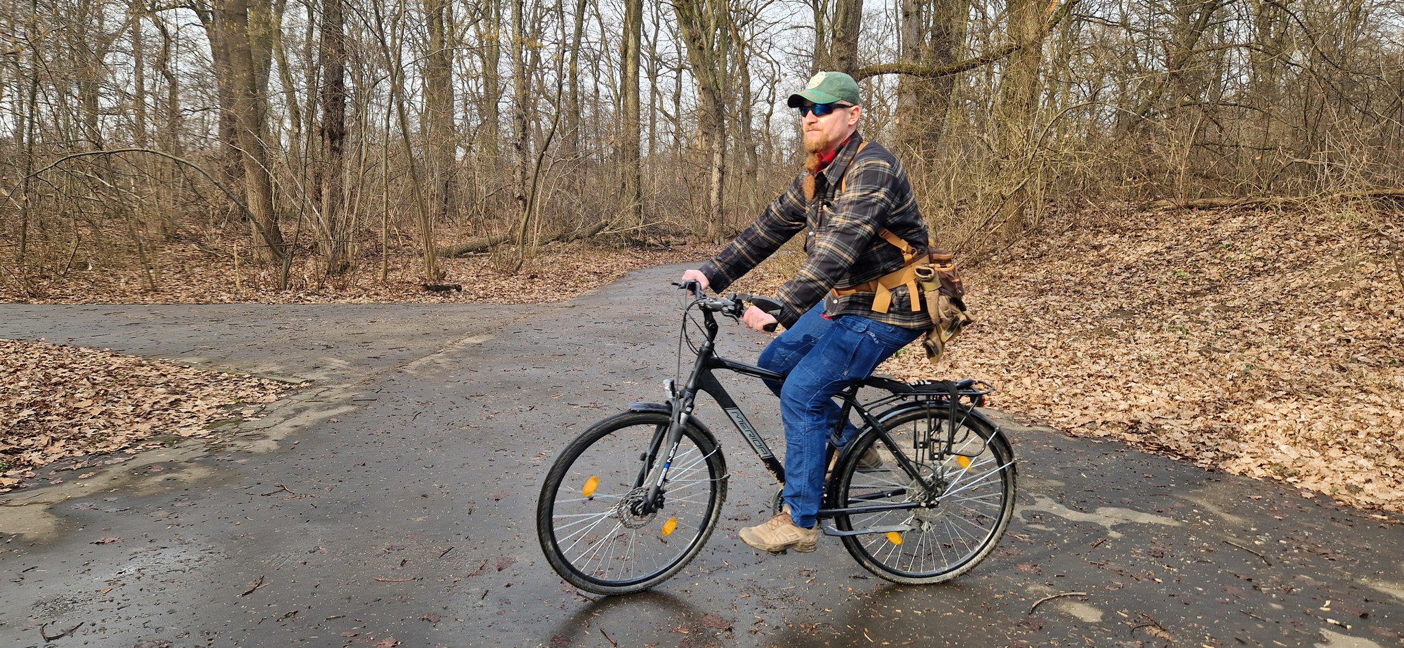W Wardenie i spodniach UTP Denim, podczas wycieczki. Funkcję torby rowerowej spełnia Foxtrot. Tak, byłem wtedy jeżdżącą reklamą Helikon-Tex. / Zdjęcia: Ewa i Tomasz Świątkowscy; Elventure