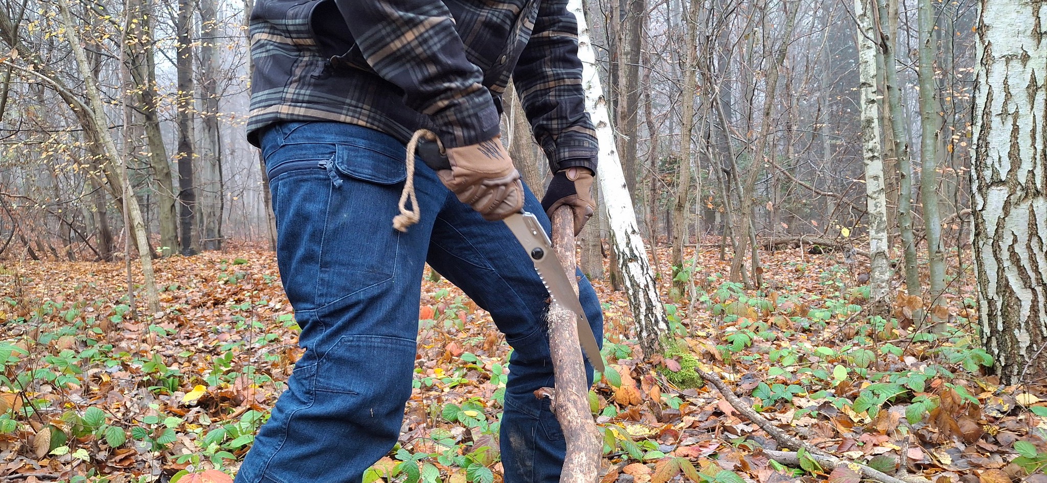 Spodnie Helikon UTP Denim Stretch podczas listopadowego biwaku, przy pracy