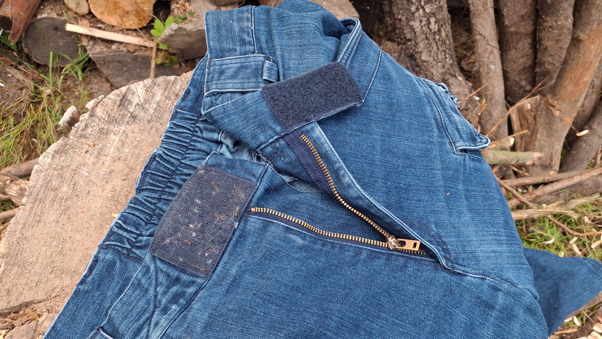 Zapięcie spodni na rzep zamiast guzik pozwala lepiej dopasowywać je do siebie