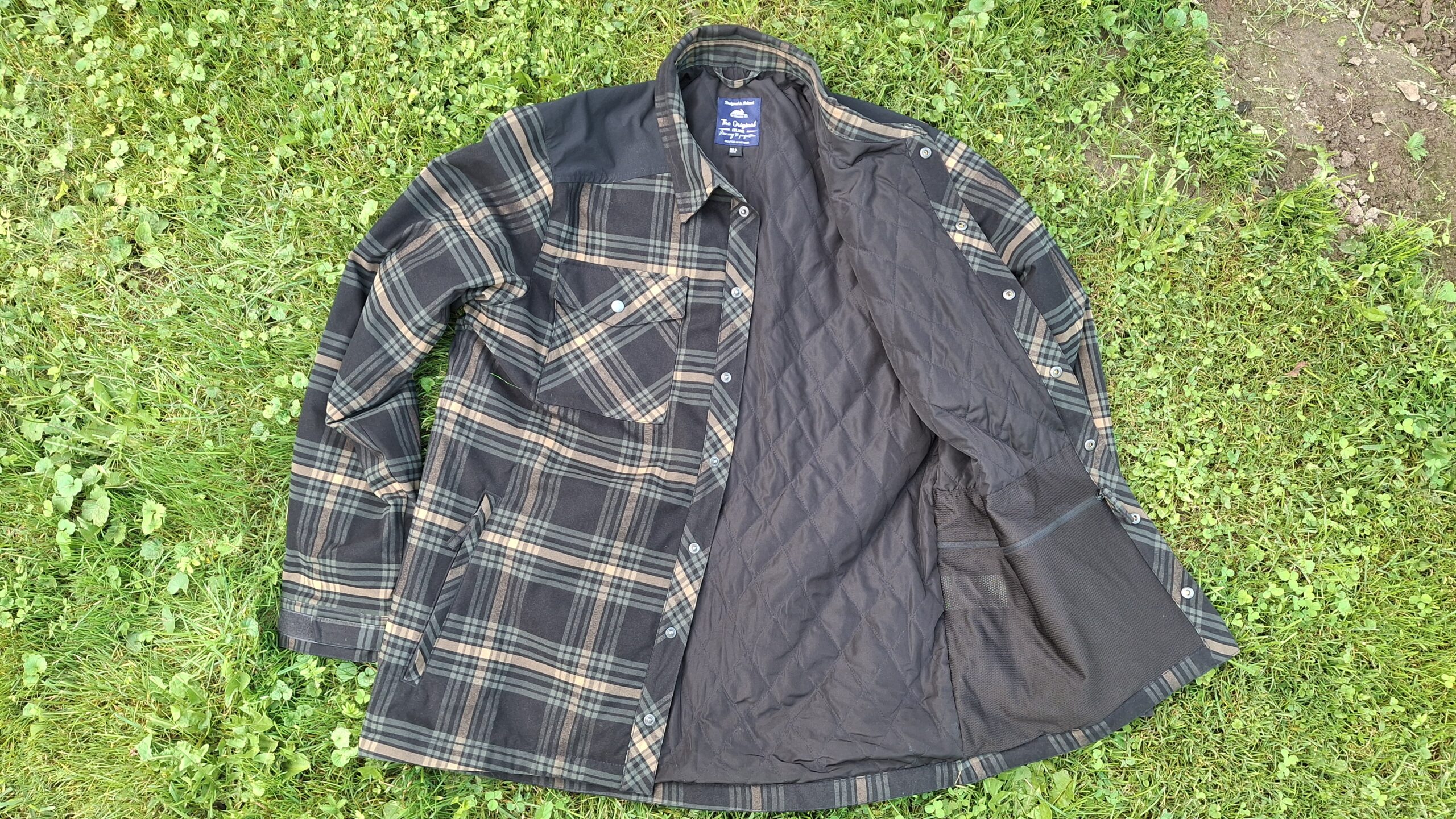 Po rozpięciu koszuli-bluzy-kurtki, widać pikowanie. U dołu po prawej, wzmiankowana wyżej, zapinana kieszeń wewnętrzna.