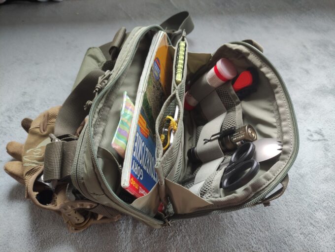 Mam mieszane uczucia również do środkowej przegrody w kieszeni przedniej w Utylity Chest Pack. Jest ona w formie płaskich przegród siatkowych z obu stron posiadający naszyte gumy – ja bym z niej zrezygnował, ponieważ ta kieszeń już po wsadzeniu przedmiotów w pozostałe gumy i kieszenie staje się mocno wypchana i gruba, a ta podwójna warstwa siatki z gumami oraz w niej rzeczy dodatkowo zabierają przestrzeń.