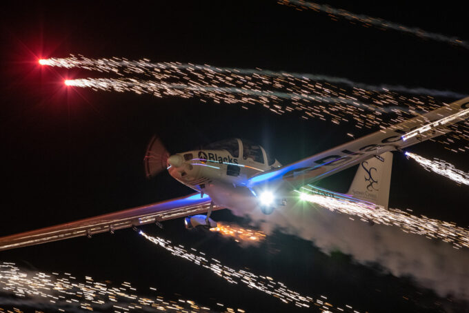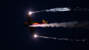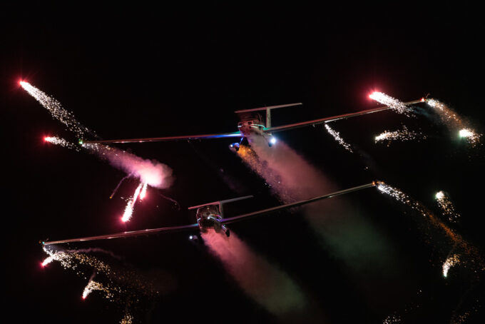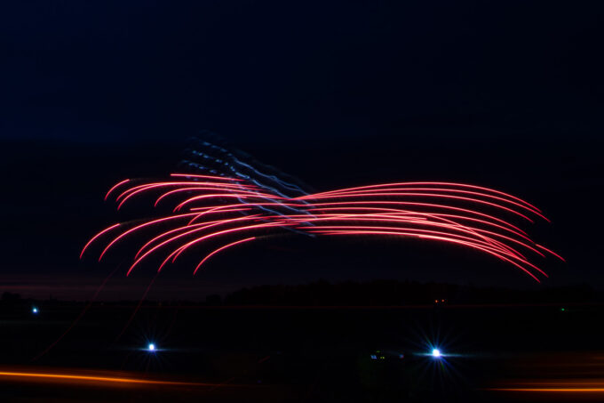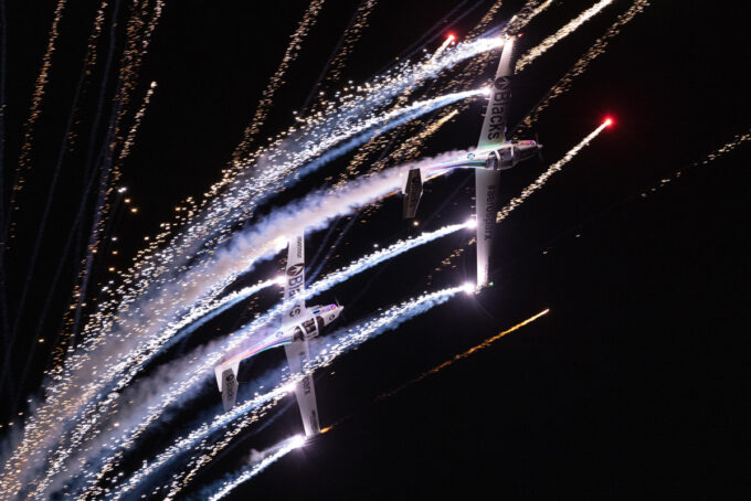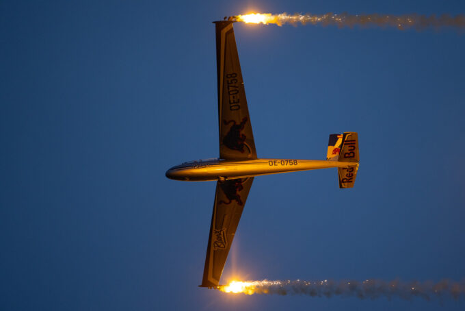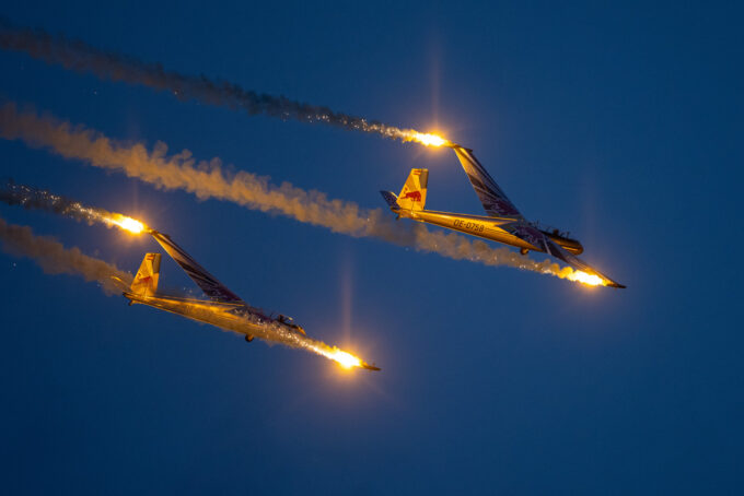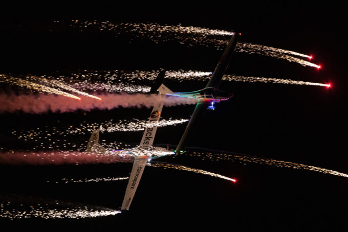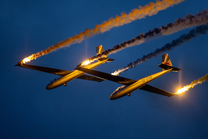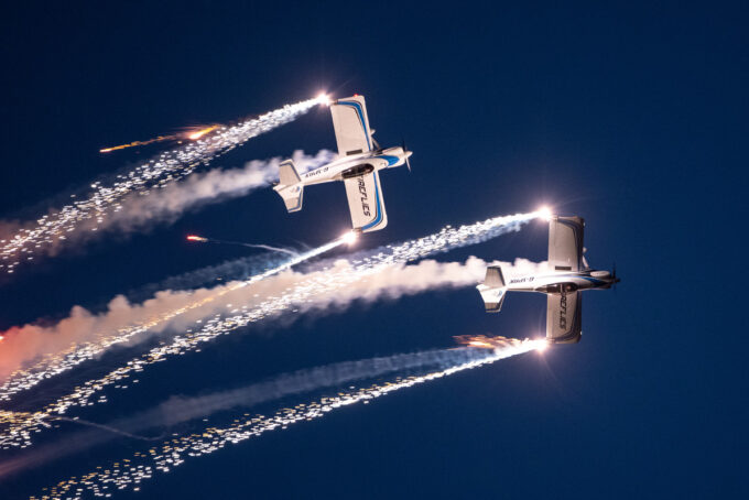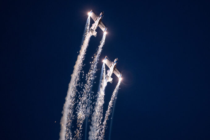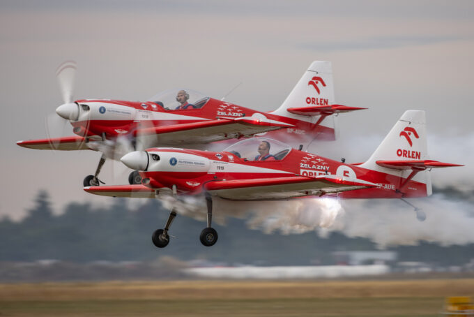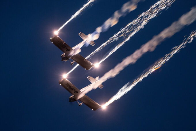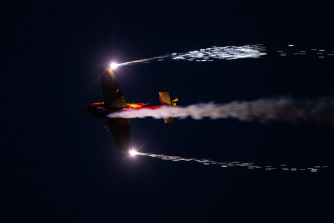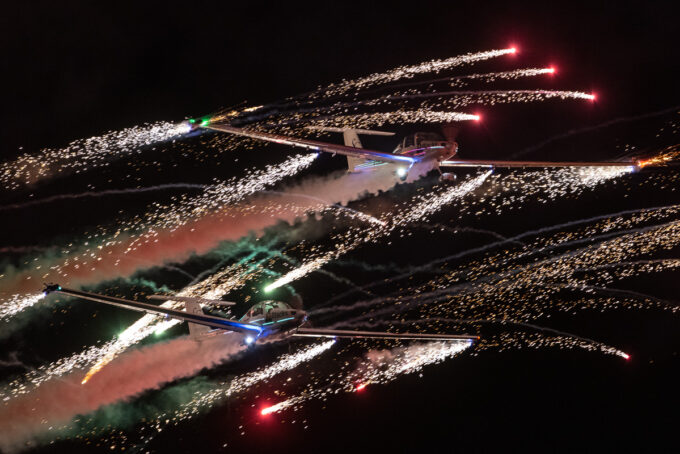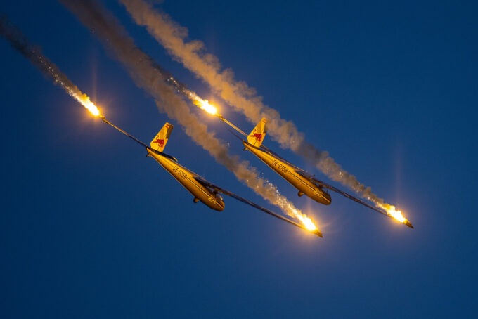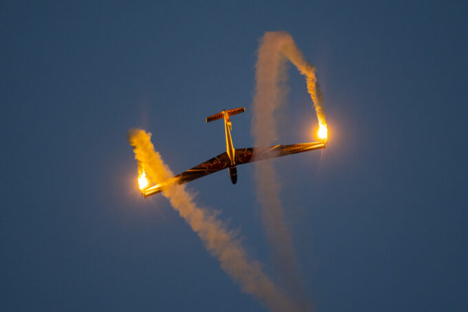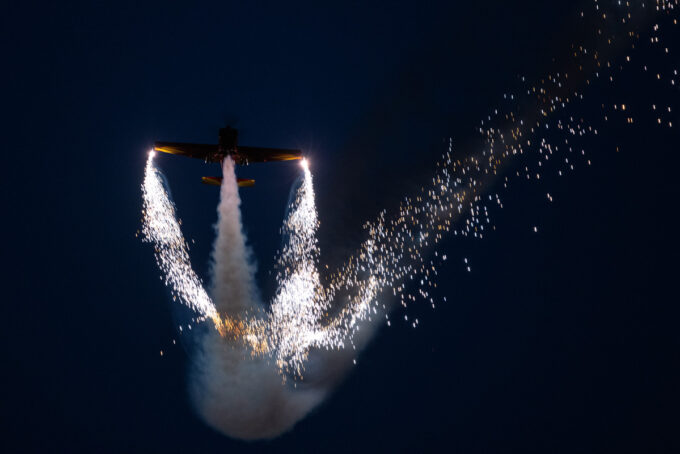 Pokazy lotnicze w Lesznie zaplanowane były na piątek i sobotę. Pogoda zarówno w pierwszy jak i drugi dzień wytrzymała do samego końca, a tuż po ostatnim pokazie w oba dni się rozpadało. Same pokazy, to poprzeczka ustawiona przez organizatorów bardzo wysoko. Oglądanie akrobacji lotniczej po zachodzie słońca, to jedna z najprzyjemniejszych rzeczy jaką widziałem na pokazach. A gdy dochodzi do tego jeszcze pirotechnika – widok ładniejszy niż niejeden pokaz fajerwerków.