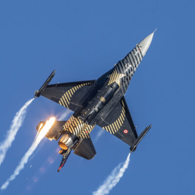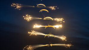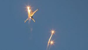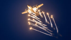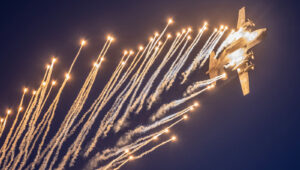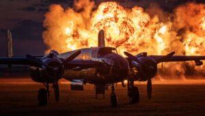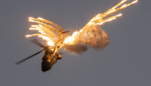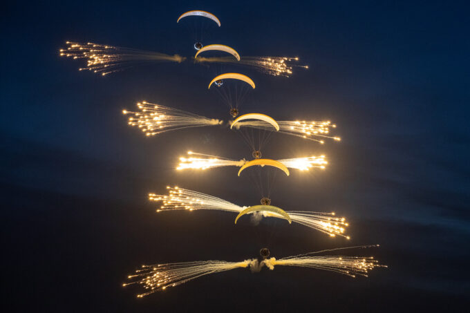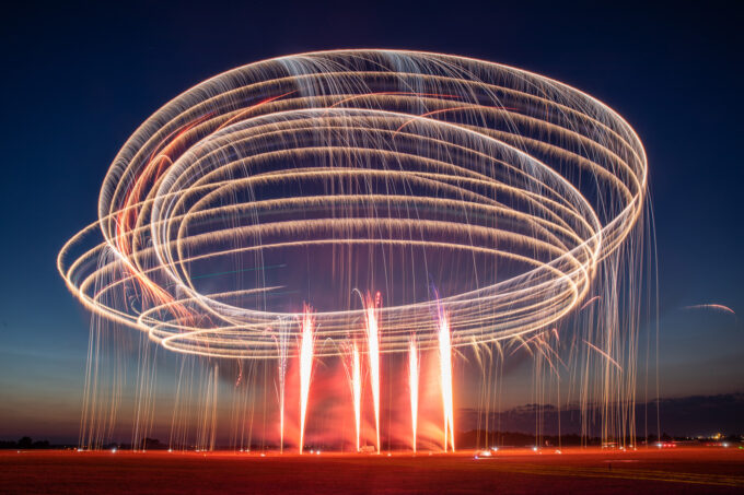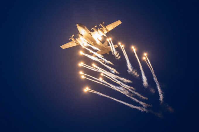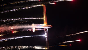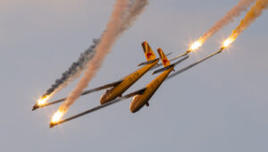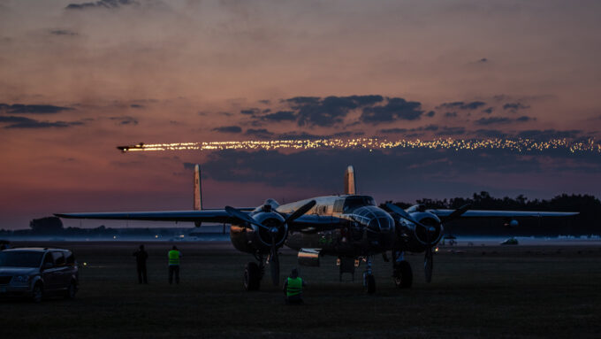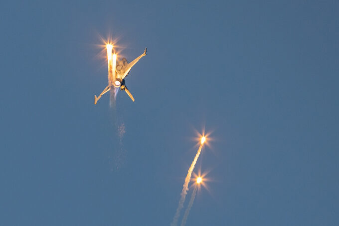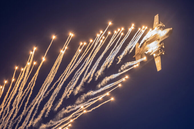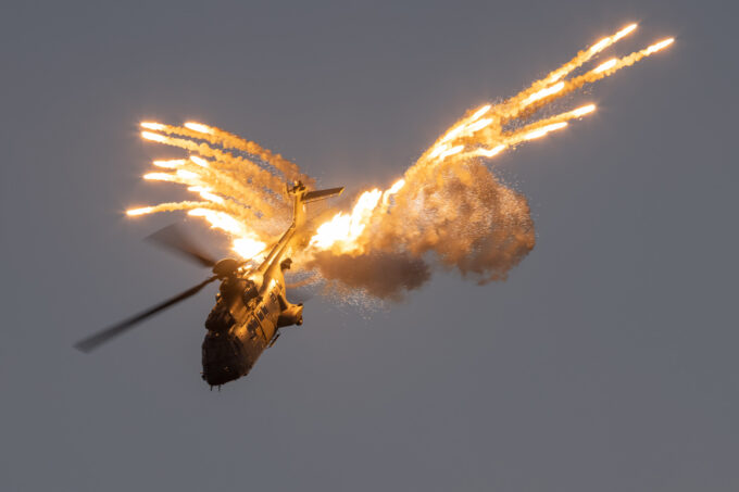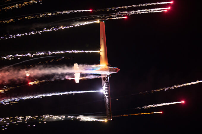 Po zachodzie mieliśmy okazję zobaczyć polskiego Vipera – Tiger Demo Team, który rozświetlił niebo flarami i długim warkoczem ognia ciągnącym się za dopalaczem. Piękny pokaz! Ale olbrzymią niespodzianką był przelot C-130, który wyrzucił pióropusz flar tuż nad naszymi głowami. Po raz pierwszy na pokazach, ale mam nadzieję, że nie ostatni! Po Polskich Siłach Powietrznych przyszedł czas na cywilne pokazy. Ale jeszcze wcześniej swoje pięć minut miał śmigłowiec Airbus H215 Super Puma, która również “pluła” flarami.