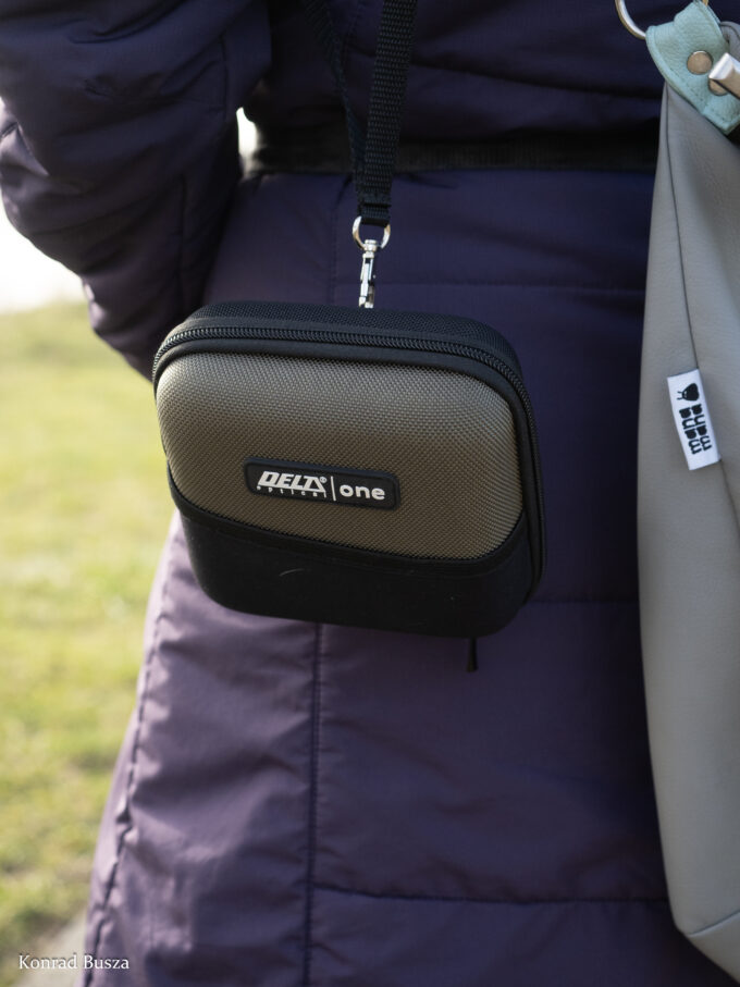 Moja Delta jest na tyle solidnie wykonana, że wytrzymała już kilka upadków – ale nie polecam nią rzucać, to nie piłka. Cały korpus to gumowo-plastikowe tworzywo, które nie dość, że zabezpiecza optykę to daje też przyjemny i pewny chwyt. I to mimo że ustrojstwo ma zaledwie 4 cm grubości! Dużym plusem jest także pokrowiec, w którym otrzymujemy lornetkę – to twarde etui, które świetnie zabezpiecza w trakcie transportu i umożliwia przenoszenie na pasku lub na smyczy.