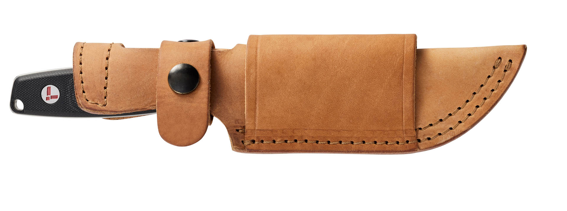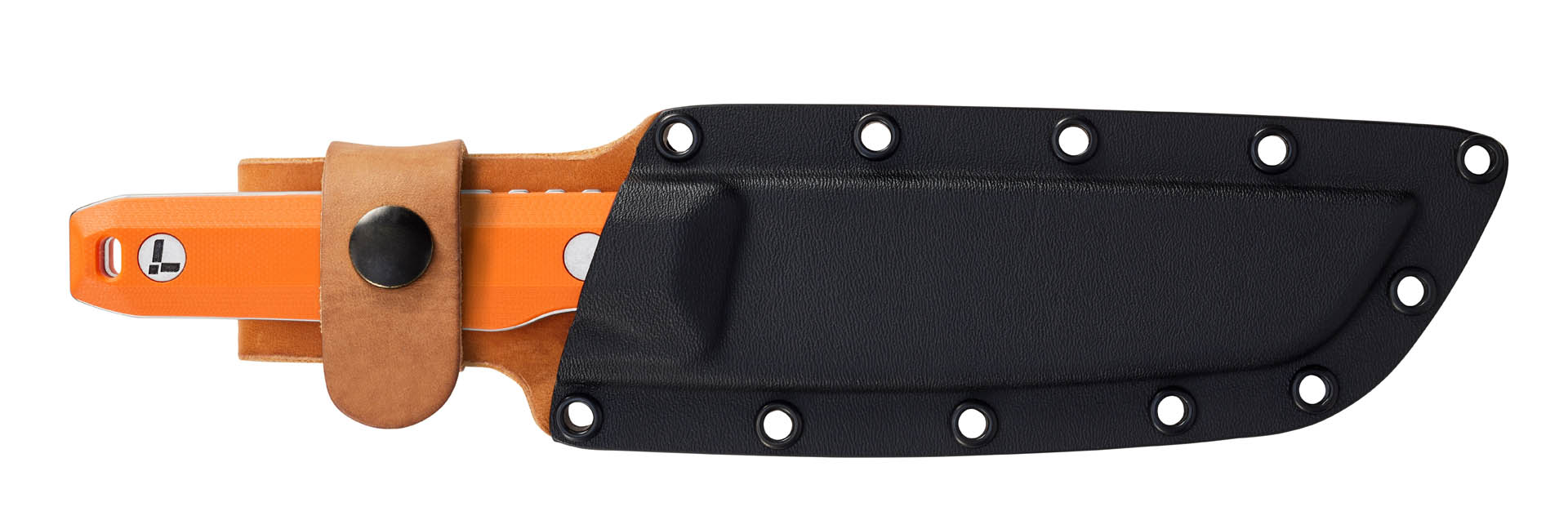 Profilowana rękojeść z G10 jest niezwykle wytrzymała i zapewnia pewny, komfortowy chwyt w każdych warunkach, nawet mokrymi dłońmi. Nóż oferuje różne opcje noszenia – poziomo, pionowo, z lewej lub prawej strony, a w zestawie znajdziesz dedykowany, wysokiej jakości skórzany pokrowiec.