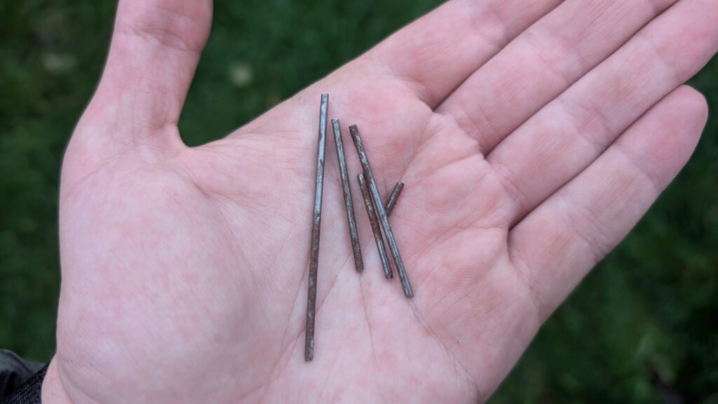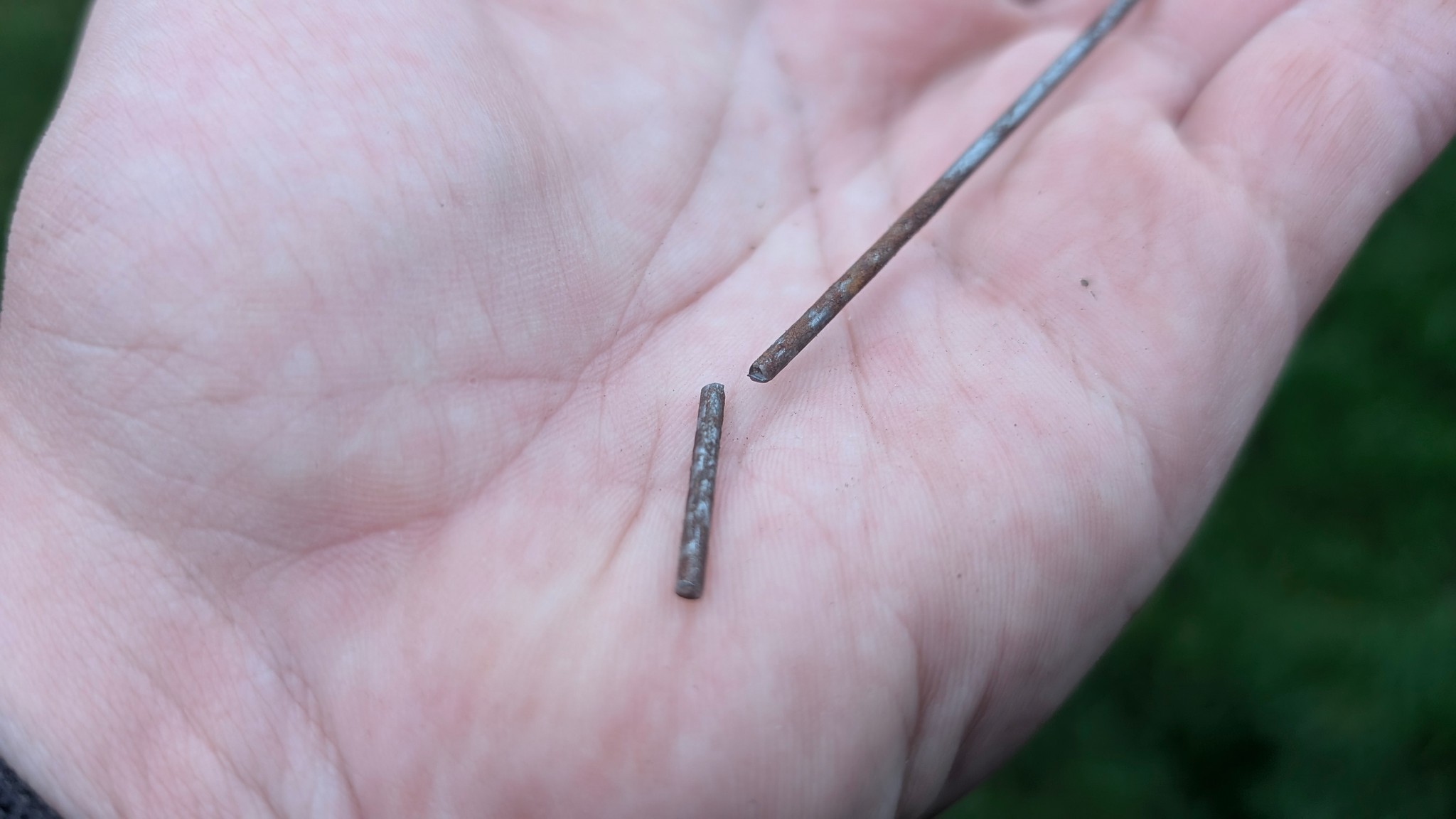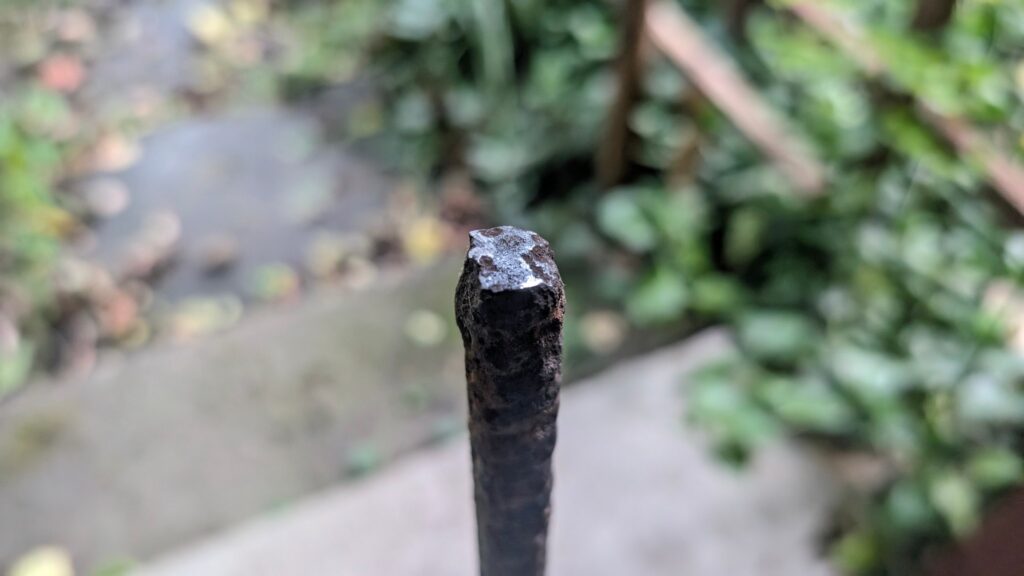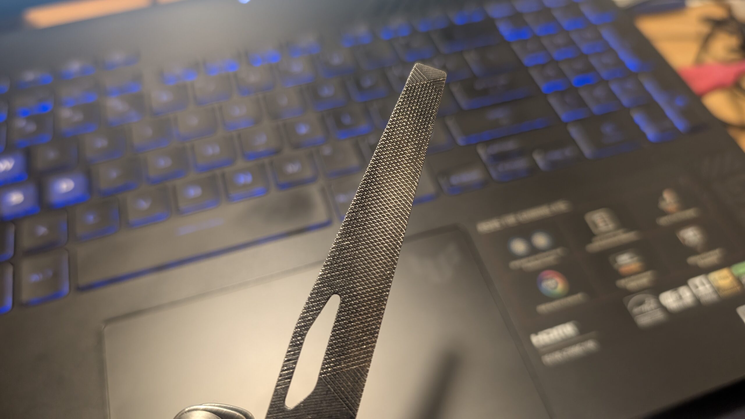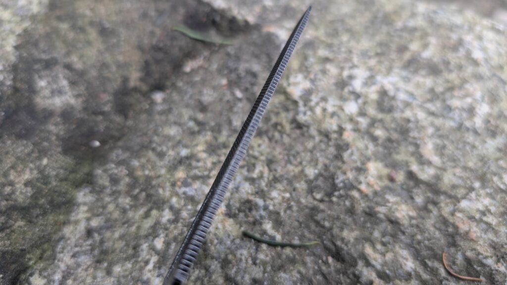 Konstrukcja pilnika to poniekąd powielenie konstrukcji noża, obecny jest otwór pod kciuk oraz blokada, która ułatwia pracę. Zastanawiając się, na czym przetestować pilnik, natknąłem się na stary pręt. Postanowiłem nieco wyrównać jego czubek. Jak widać, pilnik zadziałał.