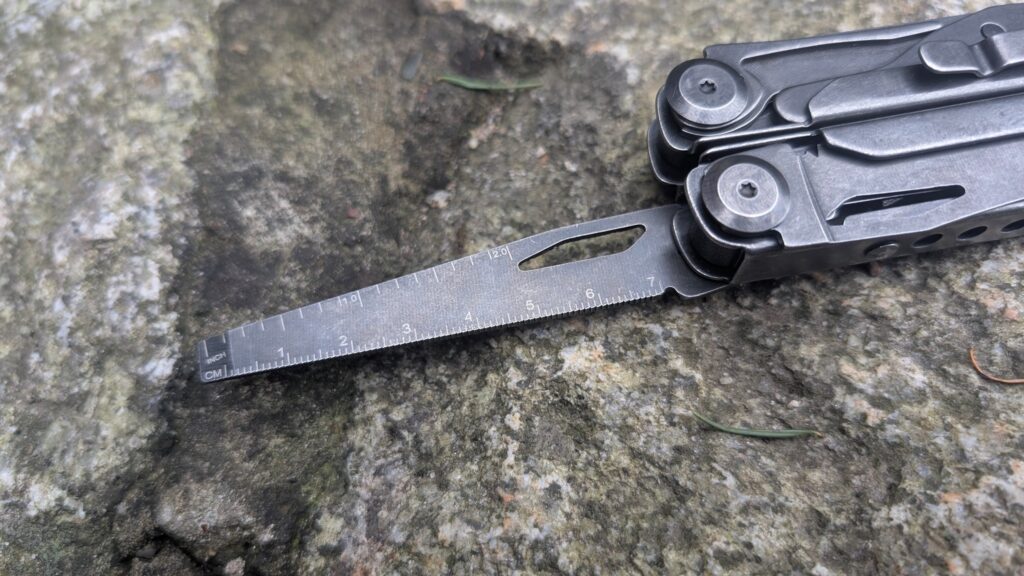 Na sąsiednim ramieniu znajduje się pilnik, zawierający także miarkę oraz śrubokręt płaski (stanowiący czubek pilnika). Nacięcia znajdują się zarówno na boku, jak i grzbiecie pilnika.
