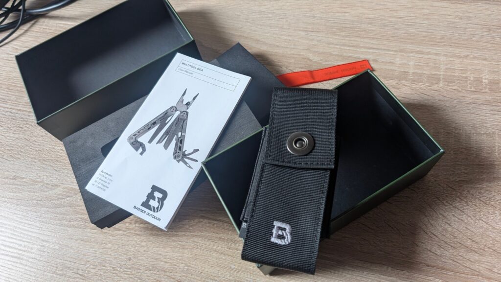 Wnętrze podzielone zostało na warstwy. Od razu po otwarciu zobaczyłem multitool Boa na swoim miejscu w piance. Po jego wyjęciu pociągnąłem za tasiemkę, uzyskując tym samym dostęp do nylonowej pochewki i instrukcji obsługi (która wbrew moim oczekiwaniom okazała się pomocna).