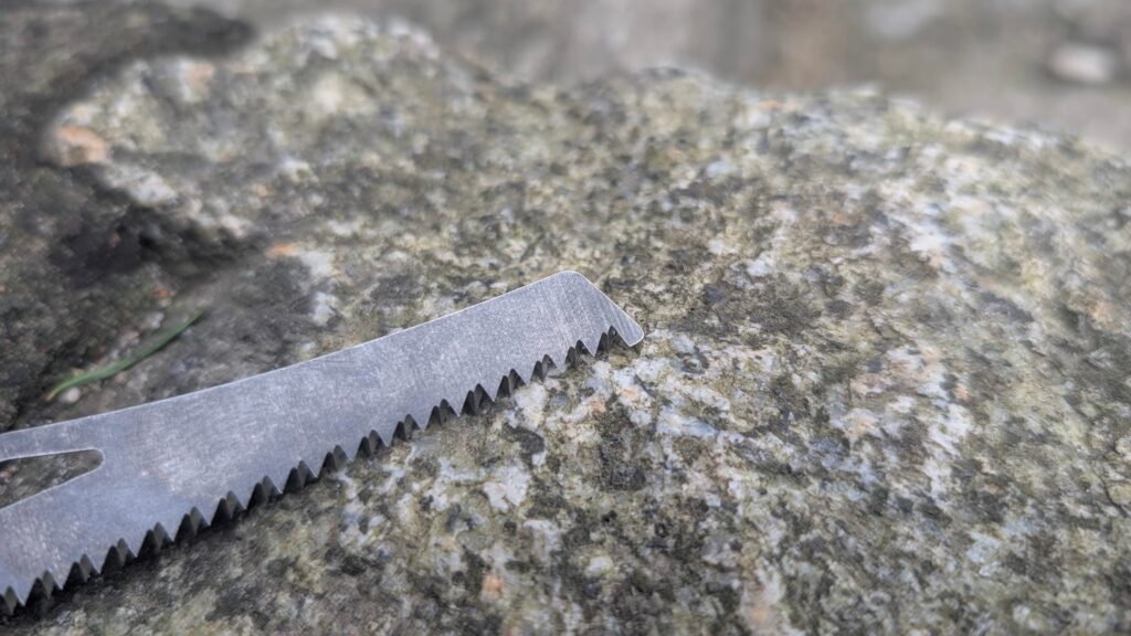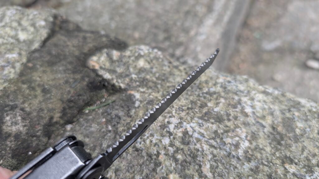 Piła przypomina te ze szwajcarskich scyzoryków, z wyjątkiem tego, że jest wyższa, a na jej końcu znajduje się ogranicznik ruchu (taki występ). Poza tym wprowadzono w niej te same cechy, co w nożu, czyli otwór i blokadę. Przy pile blokada jest całkiem istotna, nie chcecie złożyć sobie tych ząbków na palce.