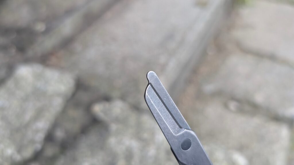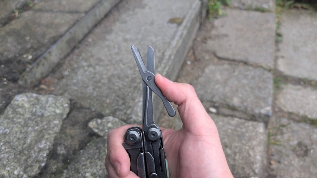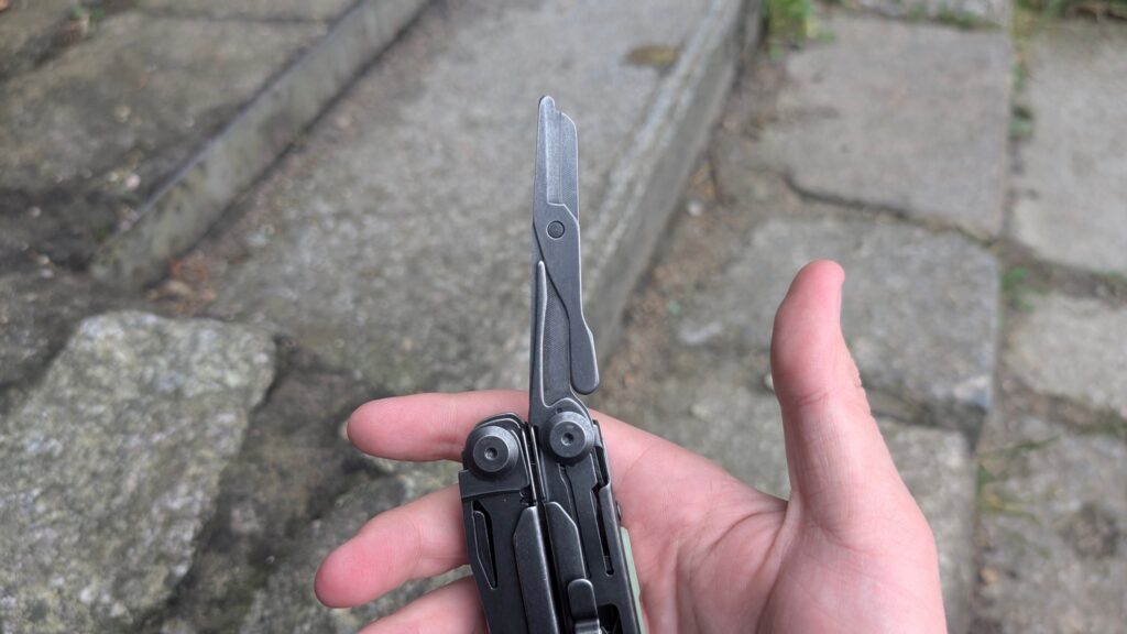 Ostatnie narzędzie, które przy odrobinie wprawy można otworzyć jedną dłonią, to nożyczki. Nie są to duże nożyczki, jakie spotkać możemy w niektórych multitoolach. Są jednak precyzyjne i cechują się specjalnym ukształtowaniem, która zapobiega przebiciu lub zaczepieniu czubkiem, podobnie jak w nożycach ratunkowych. Jest to kolejne blokowane narzędzie.
