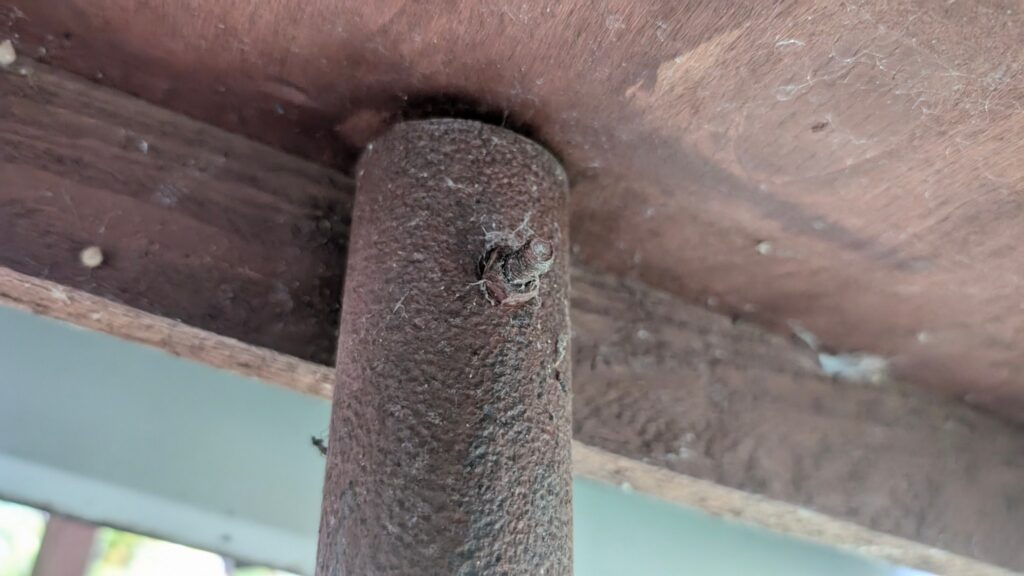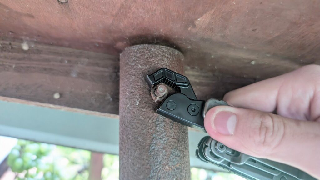 Oczywiście taka mała śrubka nie jest dla kombinerek wyzwaniem, ale jednak w moim odczuciu ten klucz robi robotę. Jest po prostu łatwiej. Skoro jest łatwiej, to po co kombinować na siłę. Przeglądając konstrukcję wiatki, natknąłem się na totalnie zardzewiałą nakrętkę. Klucz Boa nie miał z nią najmniejszego problemu.