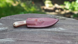 W ramach opakowania dostajemy białe, tekturowe pudełeczko ze skróconym katalogiem, naklejką oraz oczywiście nożem i instrukcją, jak o niego dbać. To ostatnie związane jest pewnie z częstym używaniem stali, która łatwo łapie przebarwienia i ogniska korozji. Przechodząc do noża, Mountain Pass Carry ubrany jest w pochwę z kawałka grubej, brązowej skóry, na której odciśnięto logo marki. Dla urozmaicenia dodano jasne obszycie nicią. Po drugiej stronie mamy szeroką szlufkę umożliwiająca montaż pionowy lub poziomy. Szlufka jest dość sztywna, ale parokrotne przełożenie paska wystarczyło do rozruszania skóry.