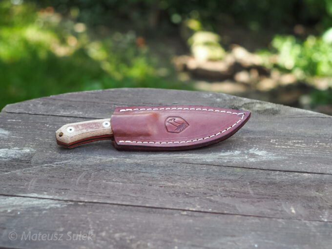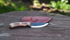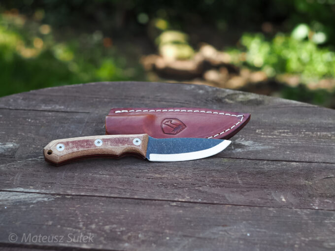 Szlif – no właśnie, patrząc na zdjęcia, byłem pewny, że jest to szlif na zero, czyli scandi grind, lecz pierwsze oględziny ukazały mi niską, ładnie wyprowadzoną krawędzią tnącą. Płaskowniki ostrza po hartowaniu nie zostały oczyszczone, dzięki czemu mamy wrażenie obcowania z całkowicie ręcznie produkowanym nożem. Rękojeść to jutowa micarta, idealnie współgrająca z surowym wyglądem ostrza. Głownia, czyli wspomniany full tang (ostrze i rękojeść to jeden kawałek stali) ma okładziny przykręcone na 3 śruby typu torx – na końcu mamy też otwór pozwalający na przewleczenie linki. Na koniec kilka suchych faktów. Nóż ma długość całkowitą 20 cm przy prawie 9 cm ostrego. Grubość klingi to 3,5 mm, a waga noża to 220 gramów.