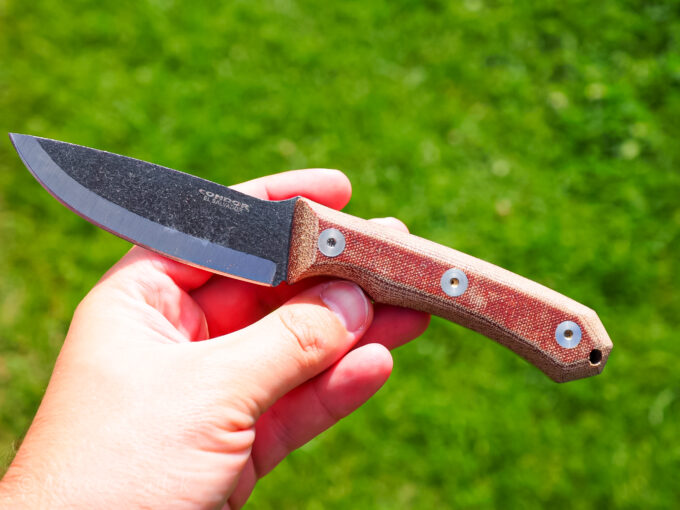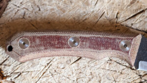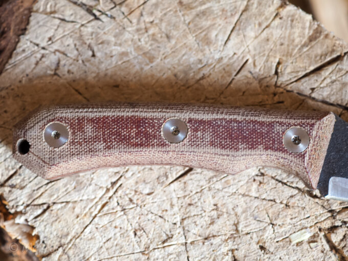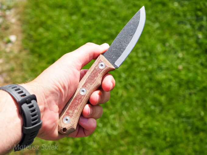 Mimo tego, co pisałem wcześniej o naturalnych materiałach i węglowej stali, wybrany nóż to stal nierdzewna i okładziny z micarty. Klinga została wykonana ze stali 440C i jest to full tang z głownią typu drop point. Głownia w stosunku do rękojeści została lekko obniżona. Według producenta ma to dobry wpływ na przekazywaną siłę podczas rąbania i batonowania. Dodatkowo obniżenie jest dobrą podporą pod kciuk w czasie bardziej precyzyjnych prac.
