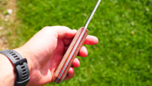 Obniżone w stosunku do rękojeści ostrze sprawdzało się przy dobijaniu ostrza drewnianym kołkiem. Rękojeść z micarty jest właściwie kuloodporna. Nie chłonie zapachów, nie przebarwia się i nie ma przy niej znaczenia, czy ręka jest mokra, czy sucha – materiał pozostaje tam samo szorstki w dotyku.