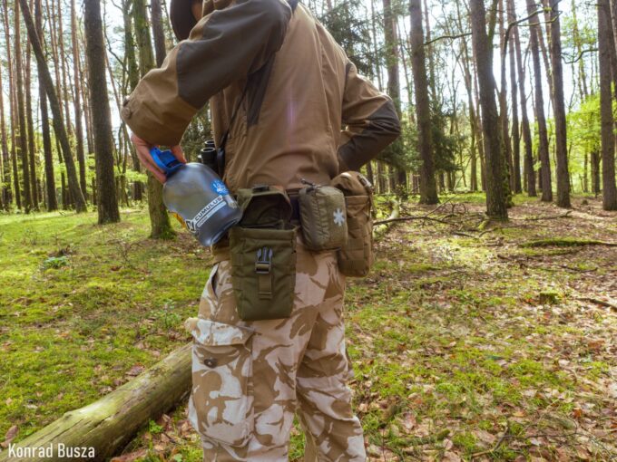 - Water Canteen, czyli po prostu pokrowiec na manierkę, zmieści standardowa litrową US Army, niestety bez kubka, natomiast litrowa butelka turystyczna typu nalgenka wchodzi tam idealnie, zmieści się też kubek Helikona. Po bokach jest trochę pasków PALS, które dają możliwość przytroczenia kolejnego wyposażenia, ale nie polecam tego rozwiązania, zaburza to stabilność ładownicy. Water Canteen ma nieco usztywnioną konstrukcję, która ułatwia wkładanie i wyjmowanie butelki.