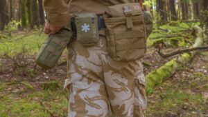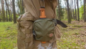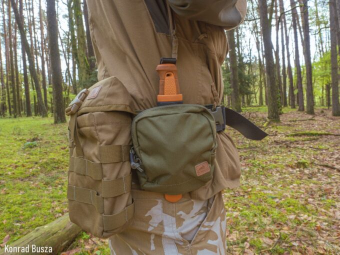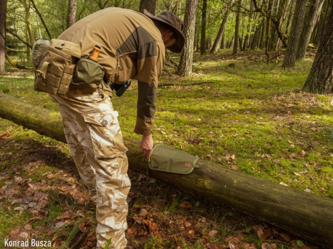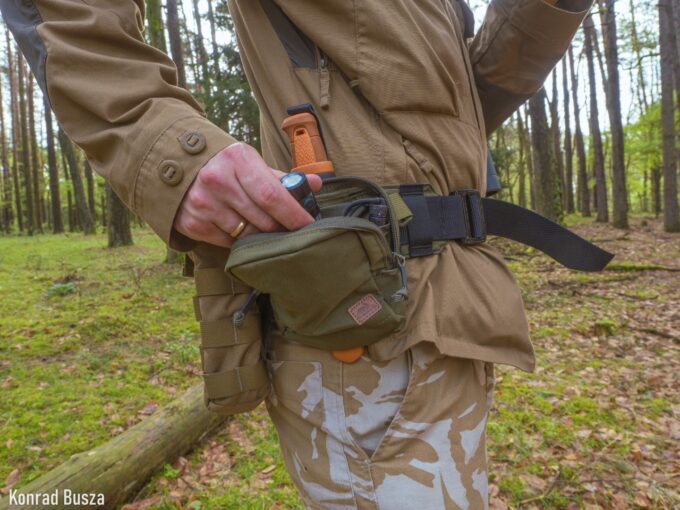 - SERE – mała ładownica z organizacją idealna do przenoszenia survivalkitu lub tego, co trzeba mieć pod ręką. Ja do wycieczek przyrodniczych mam tam multitoola, latarkę, jakieś źródło ognia, dokumenty i lupę do podglądania mikroświata. Można ją zamontować na kilka sposobów, a co istotne – w zestawie jest trok, który zamienia kieszeń w nerkę. Z tyłu ładownicy jest pionowe przeszycie umożliwiające przenoszenie tam np. noża.