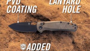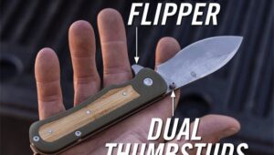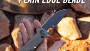 Tu już bardziej klasycznie – składany folder z ostrzem typu drop point, które dla zwiększenia odporności na korozję zostało pokryte ciemnym PVD. Kolor ten współgra z rękojeścią wykonaną z brązowej micarty. Ostrze otwierane jest za pomocą podłużnego otworu, a blokowane blokadą Pivot Lock – wariacją na temat amerykańskiego Axis Locka. W przypadku noża Gerber Scout wartym odnotowania jest konkretnej wielkości śruba pivota, możliwość montażu klipsa na prawej i lewej okładzinie, co w połączeniu z obustronnym otwarciem i blokadą pozwala na używanie noża w prawej, jak i w lewej ręce. Mamy też minimalistyczny wybijak do szyb schowany za klipsem.