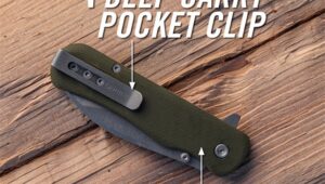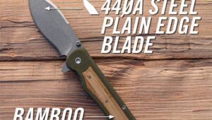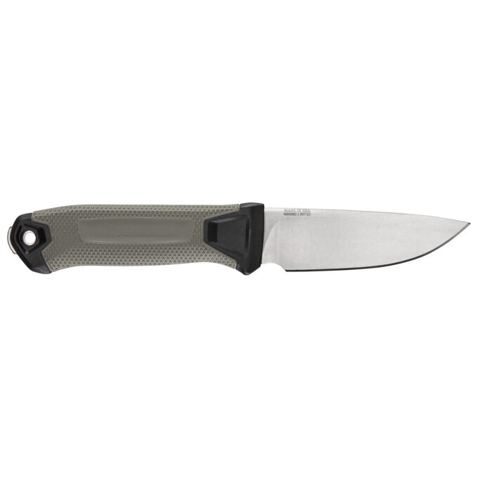 Zaczniemy od moim zdaniem najmniej wyględnej, a zarazem tej najbardziej fikuśnej konstrukcji, jaką jest nóż składany Gerber Confidant w wersji kolorystycznej OD Green z wkładką z drewna bambusowego. Ostatnio na nożowym rynku pojawiło się sporo składanych folderów z ostrzem przypominającym nóż Nessmuk i podobnie jest tutaj. Głownia drop point ze sporą recurvą i fałszywką na grzbiecie została wykonana ze stali 440 i wykończona metodą stonewash, która dobrze ukrywa pojawiające się rysy. Za otwarcie ostrza odpowiada dwustronny kołek lub dla bardziej wprawionej osoby wystający flipper, który po otwarciu działa jako garda osłaniająca palec przed przypadkowym ześliźnięciem na ostre. Blokada to standardowy listek liner lock. Na rękojeści mamy teksturowany materiał G10 w kolorze OD Green, urozmaicony o drewnianą wkładkę z bambusa. Całości dopełnia klips typu deep carry, pozwalający na głębokie ukrycie noża w kieszeni – oczywiście z logo Gerber.