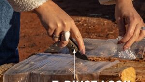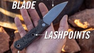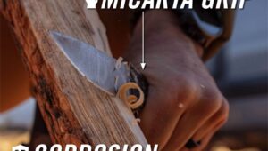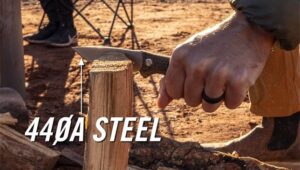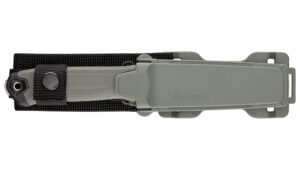 Kolejny w kolejce jest obozowy fixed w konstrukcji full tang z 10-centymetrowym ostrzem ze stali 440 oraz okładzinami rękojeści wykonanymi z micarty. Ciekawe w profilu ostrze wykończone metodą stonewash posiada podcięcie (tzw. choil) ułatwiające ostrzenie noża. Mocno teksturowane rękojeści posiadają dwa duże otwory pozwalające na przytroczenie kija i transformację noża we włócznię. Waga noża to 115 gramów przy długości całkowitej 21,5 cm. W zestawie producent dodaje pochewkę, wykonaną z twardego nylonu, która ma możliwość montażu pasa nośnego po obu jej stronach – nóż można zawiesić na prawej, jak i lewej stronie.