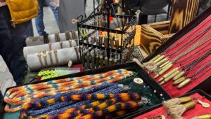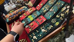 Kabury i futerały przygotowuje ręcznie… jego żona. Tworzy je z grubej, naturalnej skóry. Maluje je i oprawia ręcznie. Podczas naszej krótkiej rozmowy dowiedziałam się wielu rzemieślniczych tajemnic, chociażby takich dotyczących konserwacji skórzanych wyrobów. Fascynujące jest to, że można zrealizować u niej dowolny projekt, chociażby najbardziej oryginalny. Dobrym przykładem jest podręczna papierośnica zamocowana na pasie biodrowym. Nigdy wcześniej nie widziałam tak niesamowitego projektu, z tyloma przegrodami i kieszonkami na pojedyncze fajki. No i w dodatku w kolorze drewna, czyli idealnym na wyprawy w teren.