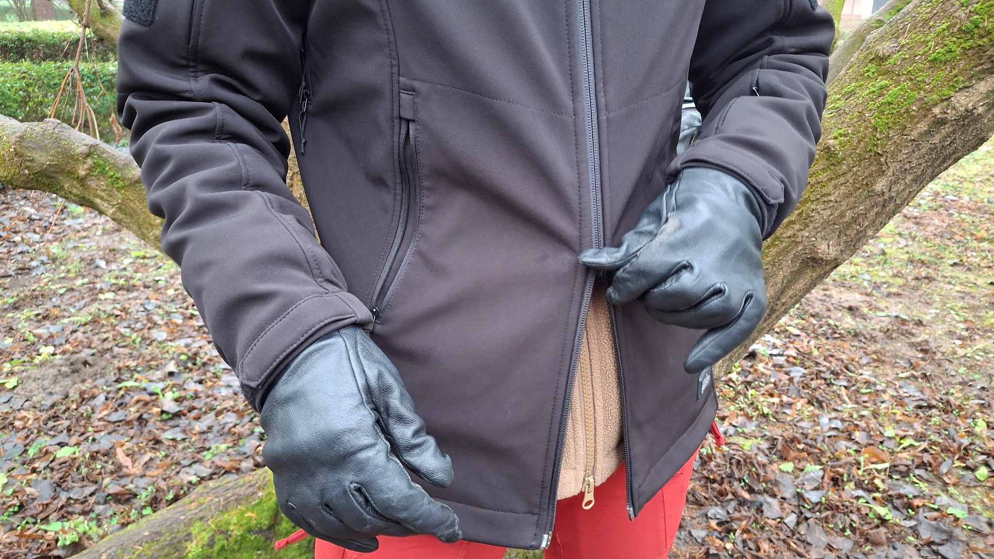 Kształt palców odznaczający się na materiale, pokazuje, jak głębokie są główne kieszenie kurtki.