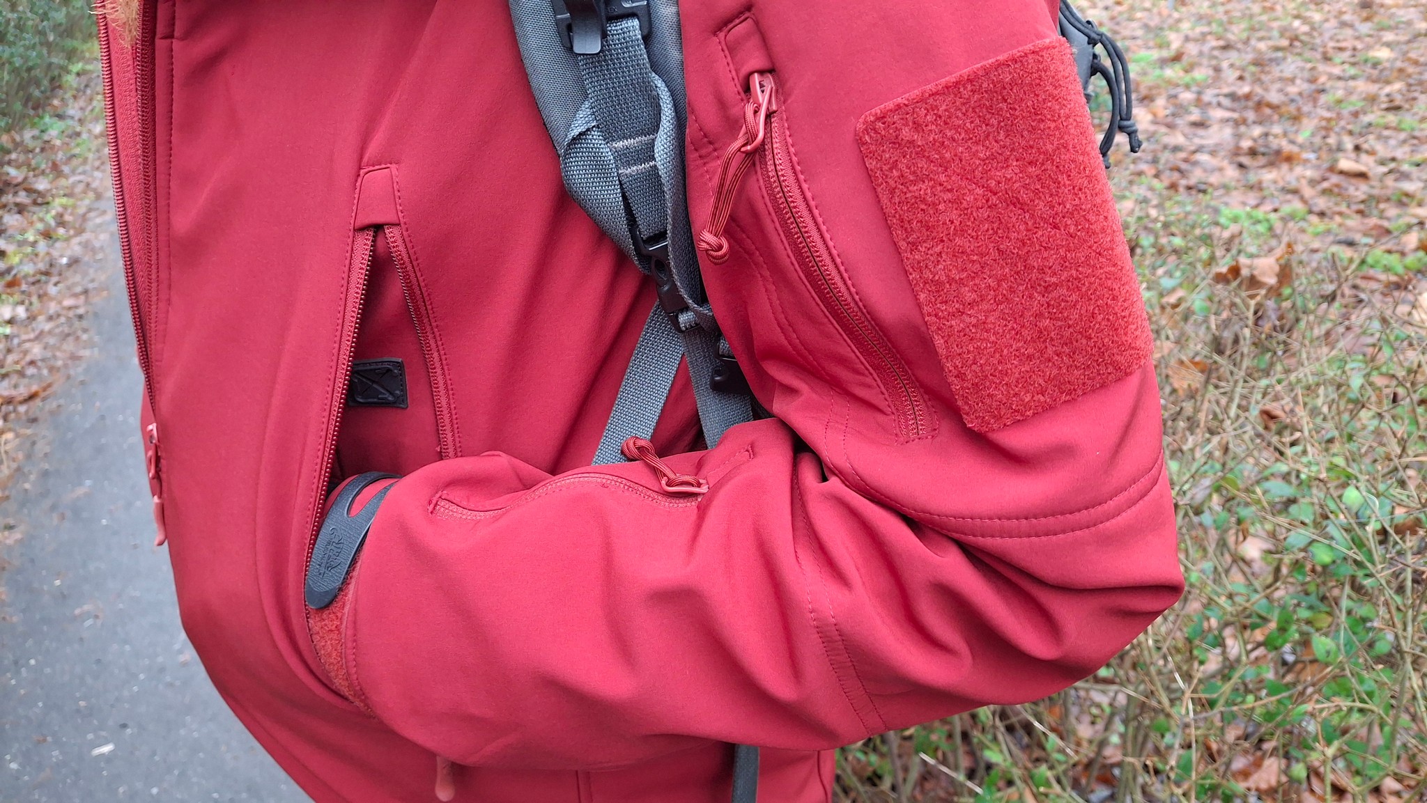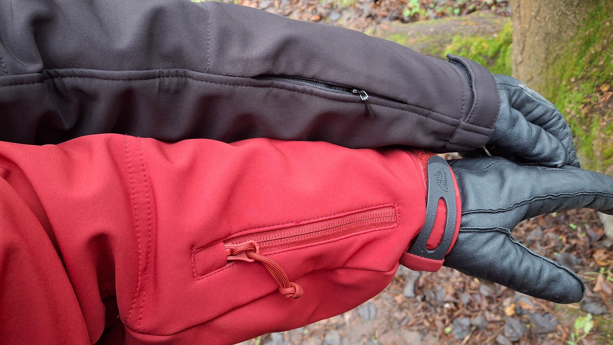 Następnie kieszenie na rękawach. Na obu ramionach i dodatkowa ponad mankietem lewej ręki. Nie całkiem wiem na co są zaprojektowane, gdyż ich komory są znacząco większe niż zapinane zamkami wloty. Niby coś-tam by się zmieściło (np. notes), ale nie koniecznie wygodnie jest to upychać. Ale portfel, dokumenty, telefon, cienka czapka, proszę bardzo. W kieszonce nad mankietem można nosić karty magnetyczne i chipowe, np. do bramki na stoku narciarskim i używać przez kurtkę, bez ściągania rękawiczek. Tutaj spostrzeżenie: kieszenie te, w przeciwieństwie do wielu innych „rękawowych” u Helikona, są zapinane na szerokie zamki. Dzięki temu relatywnie łatwo się je rozpina i zapina, nawet bez silnego naprężania rękawa.
