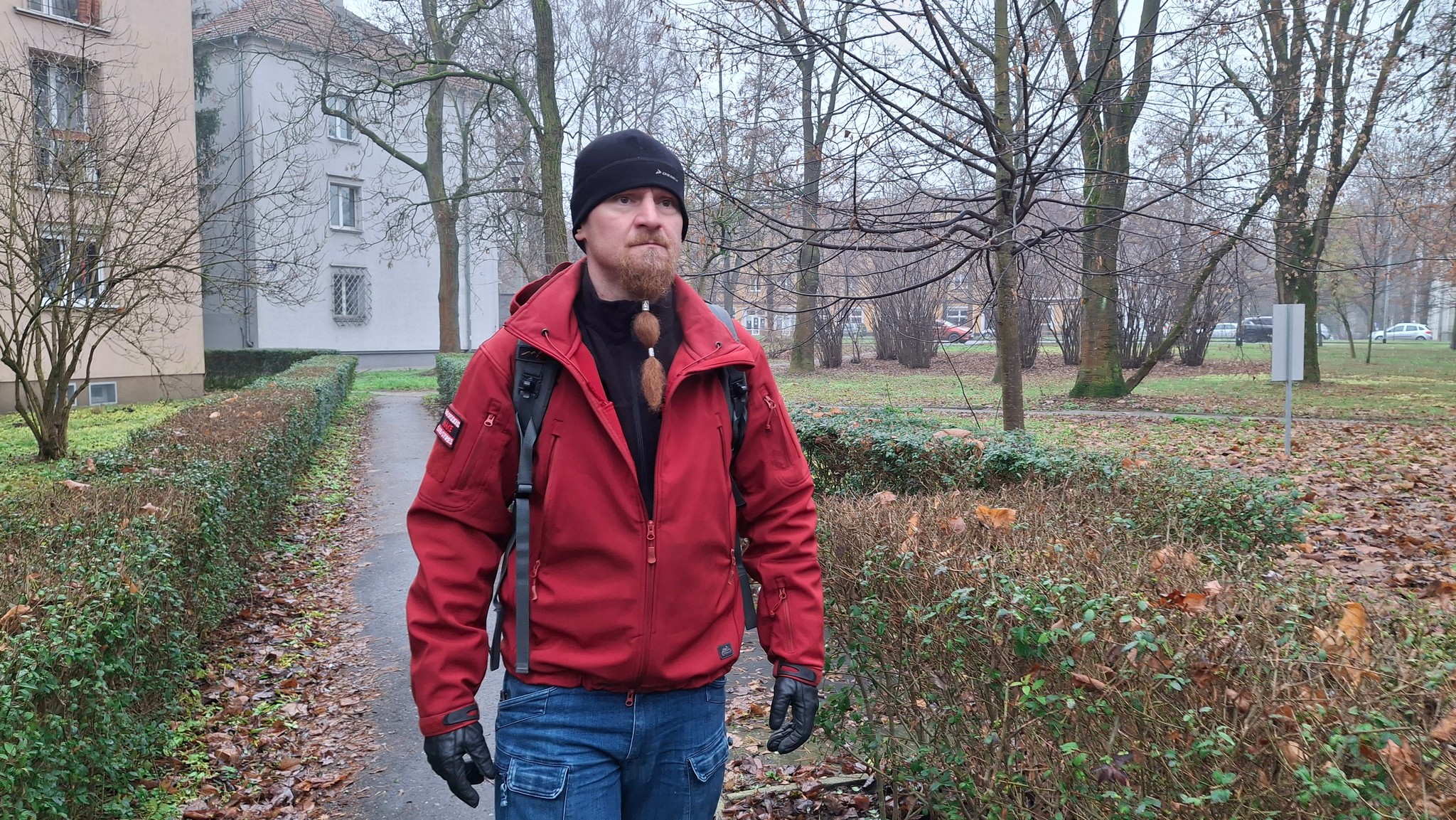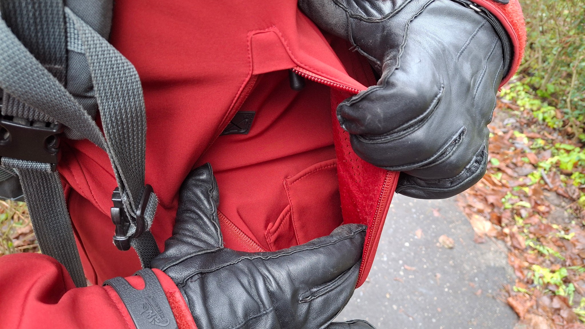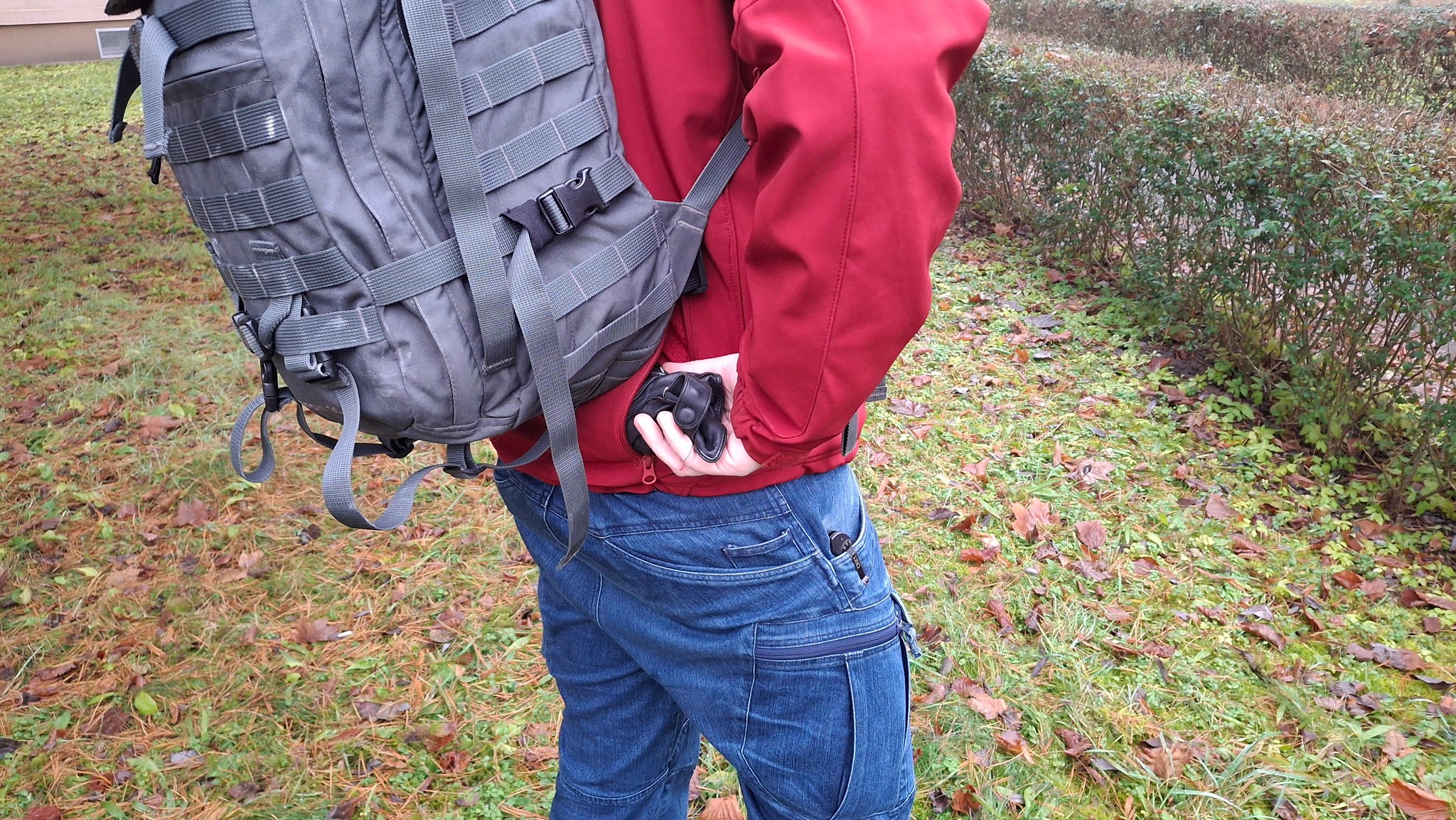 W momencie wyjmowania rękawiczek z kieszeni na plecach, pomimo plecaka.