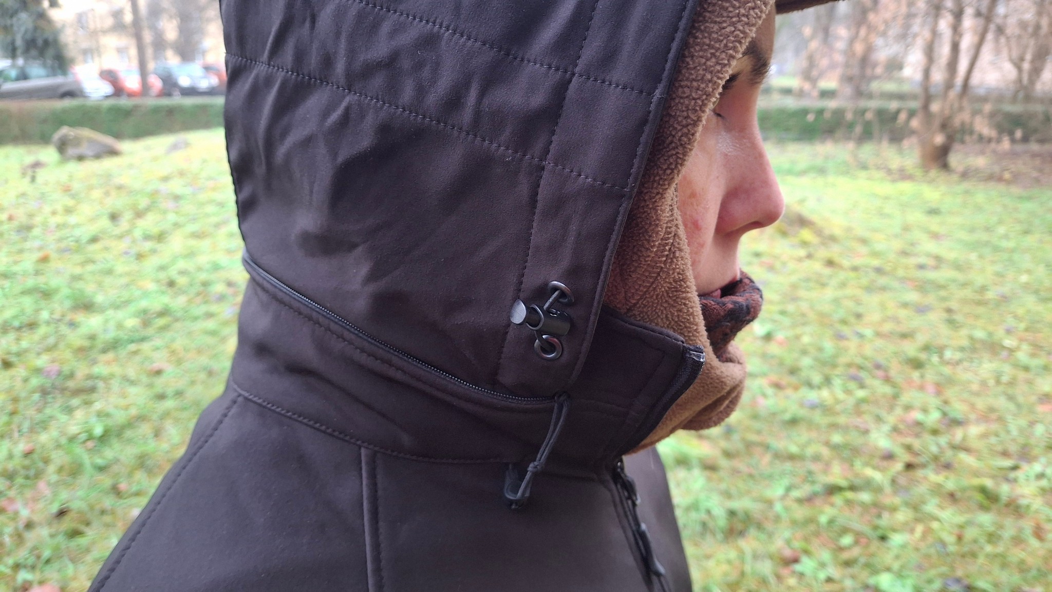 Kaptur damskiej wersji kurtki. Widoczny zamek kołnierza oraz gumka ściągająca. Polar pod spodem, to kaptur polara Cumulus. Jak widać, mieści się swobodnie.