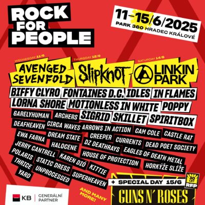 Drugim ogłoszonym headlinerem jest gigant metalu – Slipknot, który powróci do Hradca Králové po dwóch latach, świętując 30 lat na scenie muzycznej. Odwiedzający mogą również liczyć na m.in. irlandzki zespół post-punkowy Fontaines D.C., brytyjskich szaleńców IDLES, długo oczekiwany Motionless In White, amerykański zespół rockowy Skillet oraz szwedzką metalową formację In Flames. Ze względu na spodziewane ogromne zainteresowanie sprzedaż biletów jest obecnie wstrzymana i zostanie wznowiona w poniedziałek 18 listopada o godz. 10:00 na stronie https://goout.net/en/tickets/rock-for-people-2025/nhuy/.