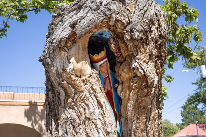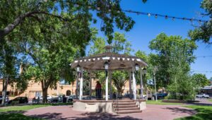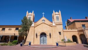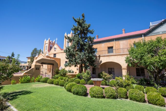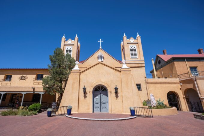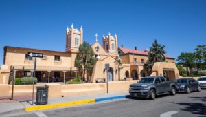 Zatrzymaliśmy się w miejscu Old Town Plaza, które jest turystycznym sercem Albuquerque. Ruch uliczny tutaj praktycznie nie istnieje, po drogach zamiast samochodów poruszają się piesi, jest niezwykle kolorowo. Trafiliśmy do starego miasta, którego początki datowane są na 1706 rok, kiedy to hiszpański gubernator zatwierdził założenie wioski Villa De Albuquerque. Obowiązuje wtedy prawo mówiło o tym, że każda miejscowość musi posiadać plac centralny, który będzie zabudowywany dookoła. Obecnie Old Town Plaza to dziesięć przecznic starych, ale odnowionych budowli, w których teraz głównie znajdują się sklepy z pamiątkami i kilka restauracji. Najstarsza z nich to kościół San Felipe de Neri zbudowany w 1793 roku.