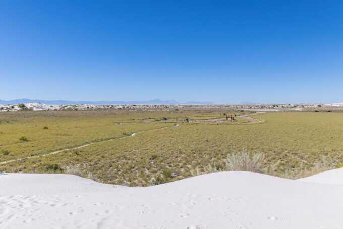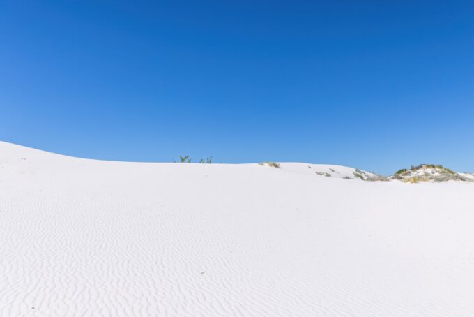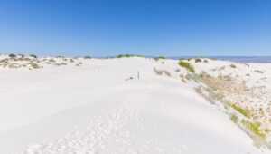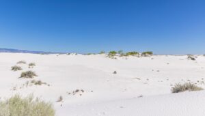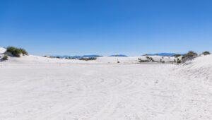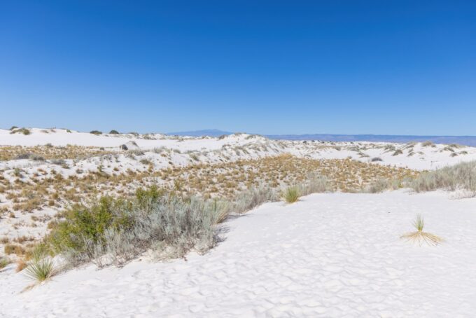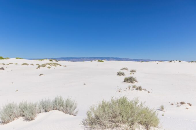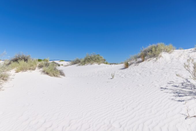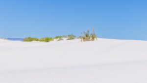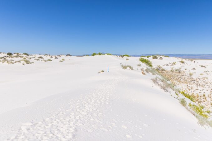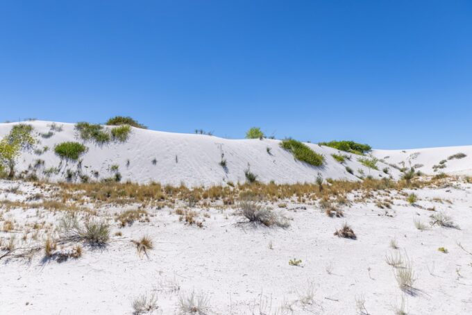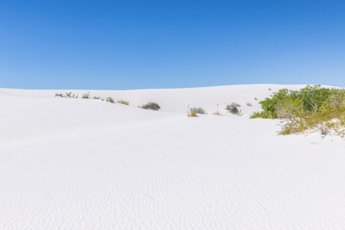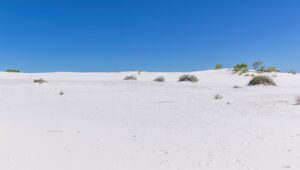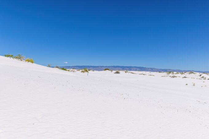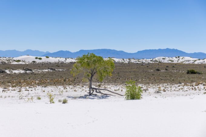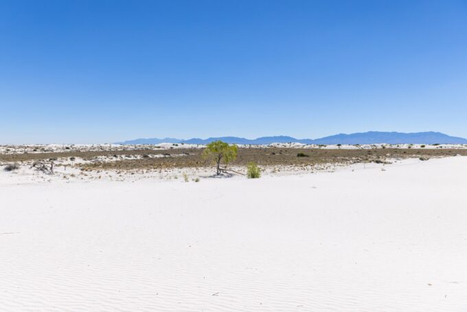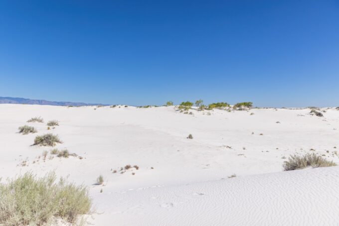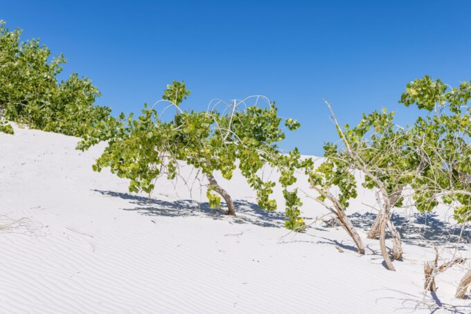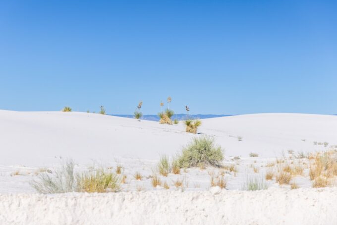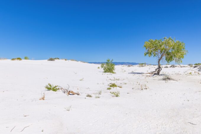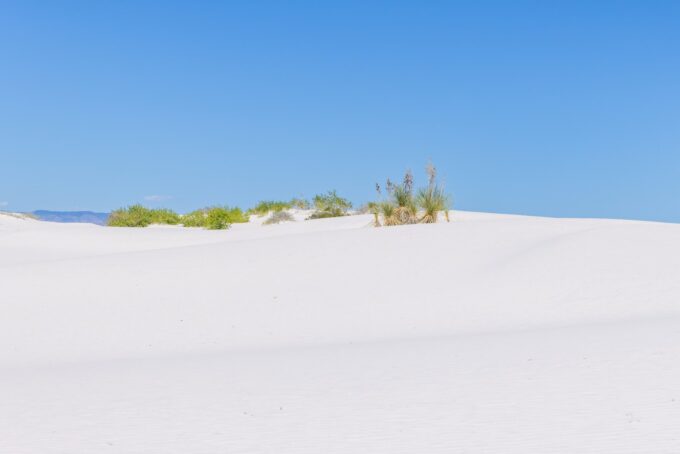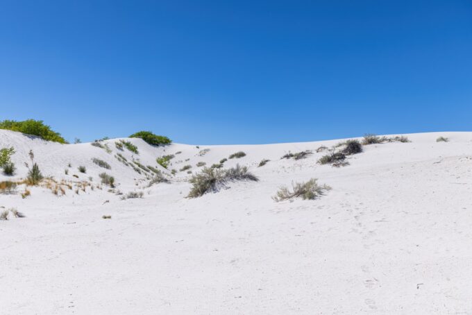 Park jest stosunkowo nieduży, jego zwiedzanie zajęło nam może trzy godziny. Oczywiście wszystko zależy od stopnia zaangażowania, bo w wielu miejscach można udać się na spacer w głąb wydm. My wybraliśmy jedną z tras zaraz na początku. Muszę przyznać, że pustynia jest obłędna! Biały piasek to w rzeczywistości nie jest piasek, a gips. Nie nagrzewa się i można śmiało spacerować na bosaka bez ryzyka poparzenia stóp. Na terenie białych wydm występuje uboga roślinność, za to jeśli już coś tutaj rośnie, to ma przepiękny zielony kolor.