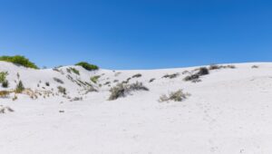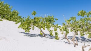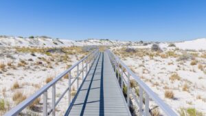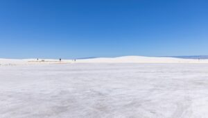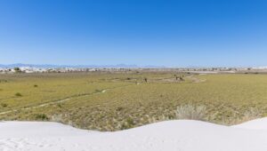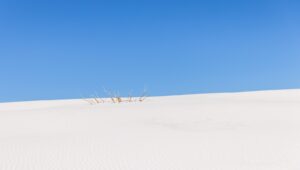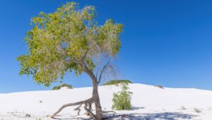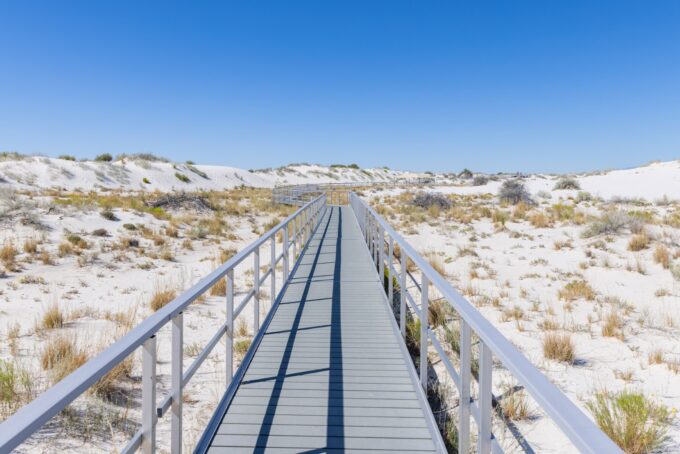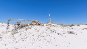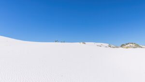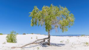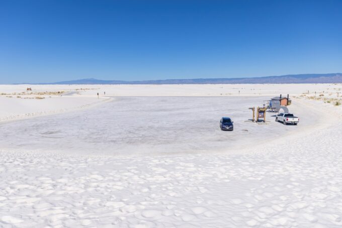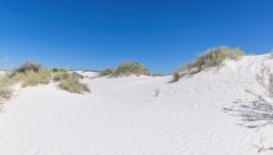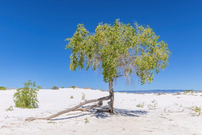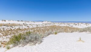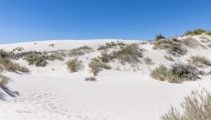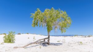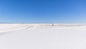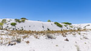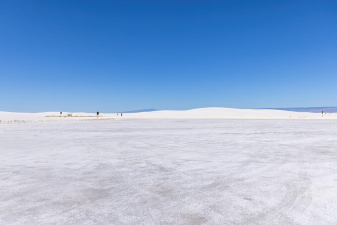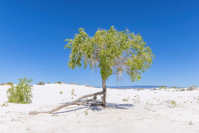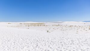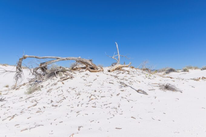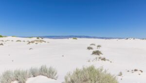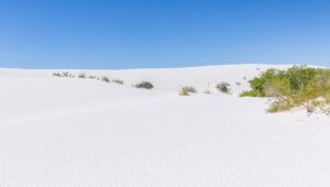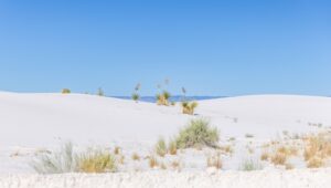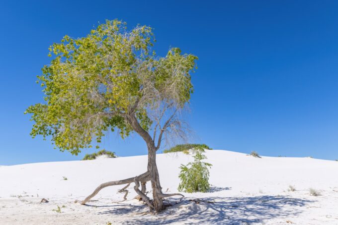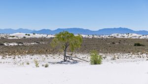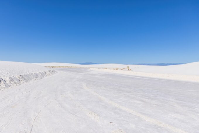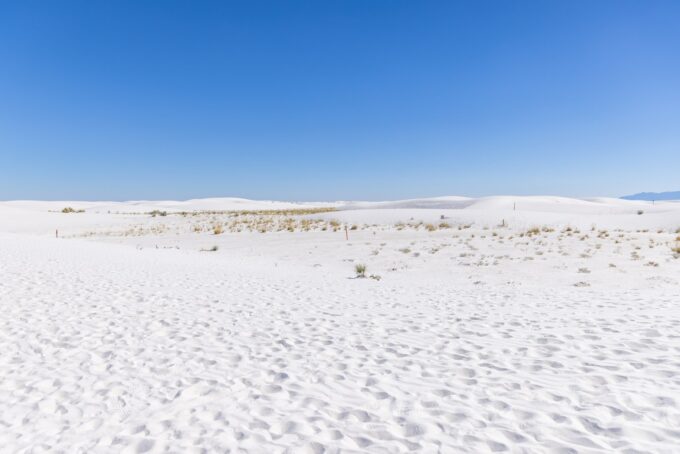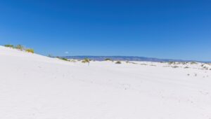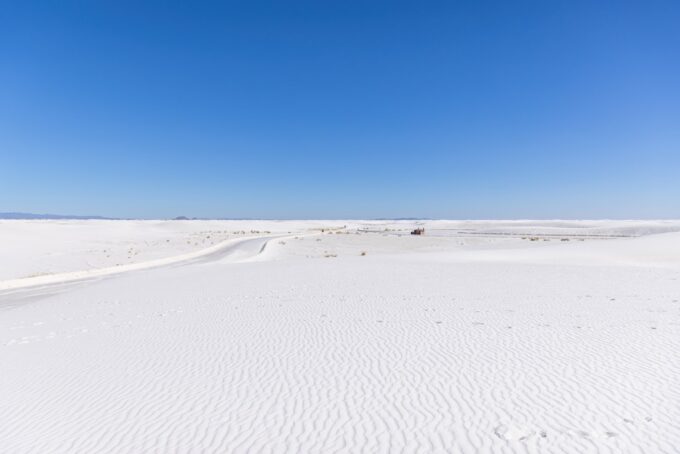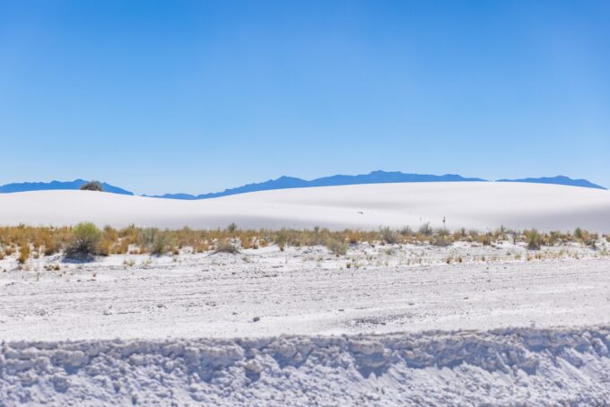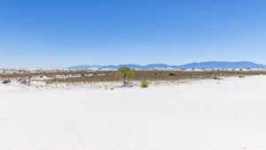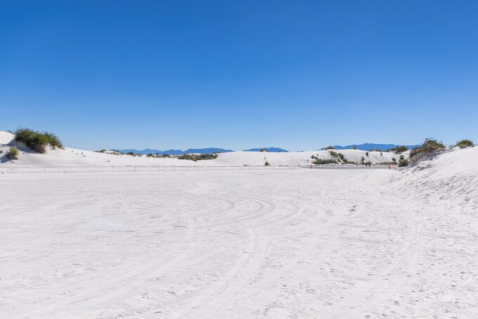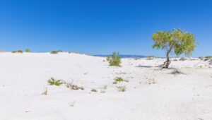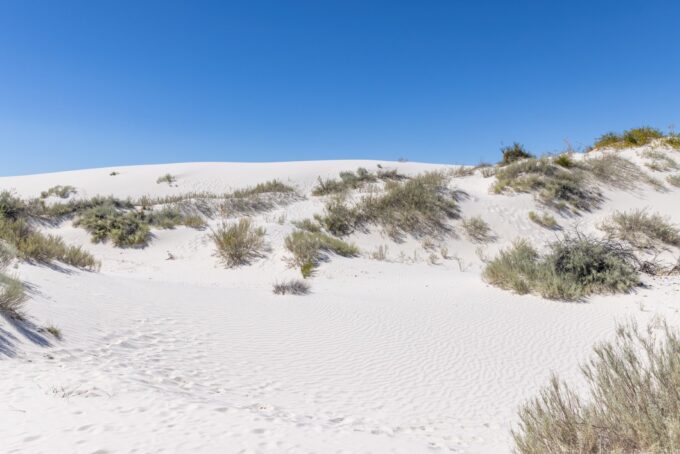 Park jest stosunkowo nieduży, jego zwiedzanie zajęło nam może trzy godziny. Oczywiście wszystko zależy od stopnia zaangażowania, bo w wielu miejscach można udać się na spacer w głąb wydm. My wybraliśmy jedną z tras zaraz na początku. Muszę przyznać, że pustynia jest obłędna! Biały piasek to w rzeczywistości nie jest piasek, a gips. Nie nagrzewa się i można śmiało spacerować na bosaka bez ryzyka poparzenia stóp. Na terenie białych wydm występuje uboga roślinność, za to jeśli już coś tutaj rośnie, to ma przepiękny zielony kolor.