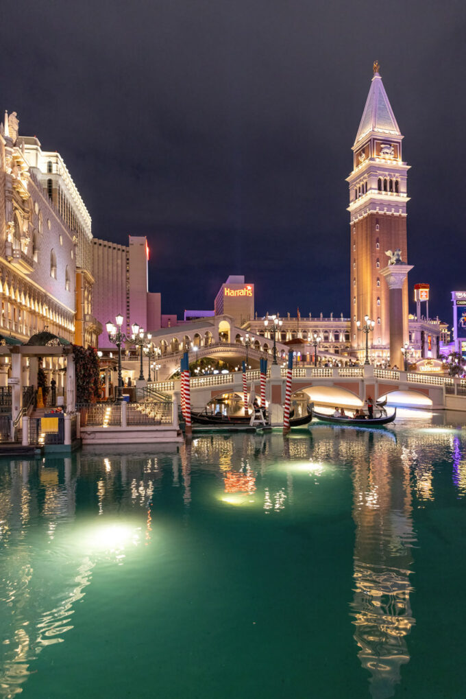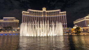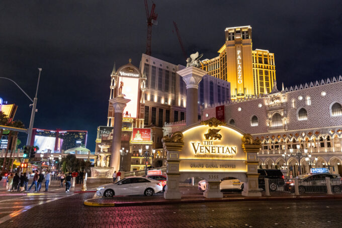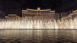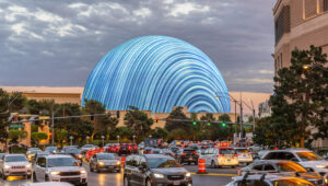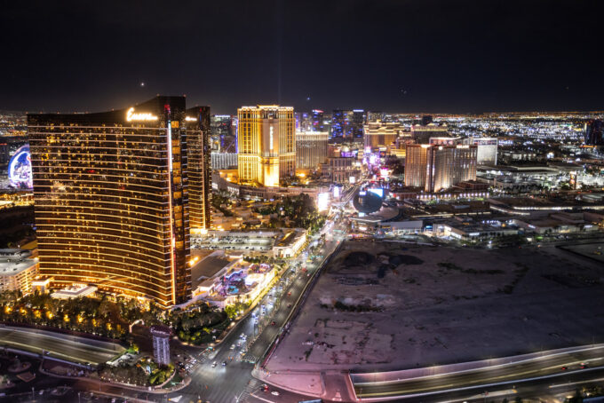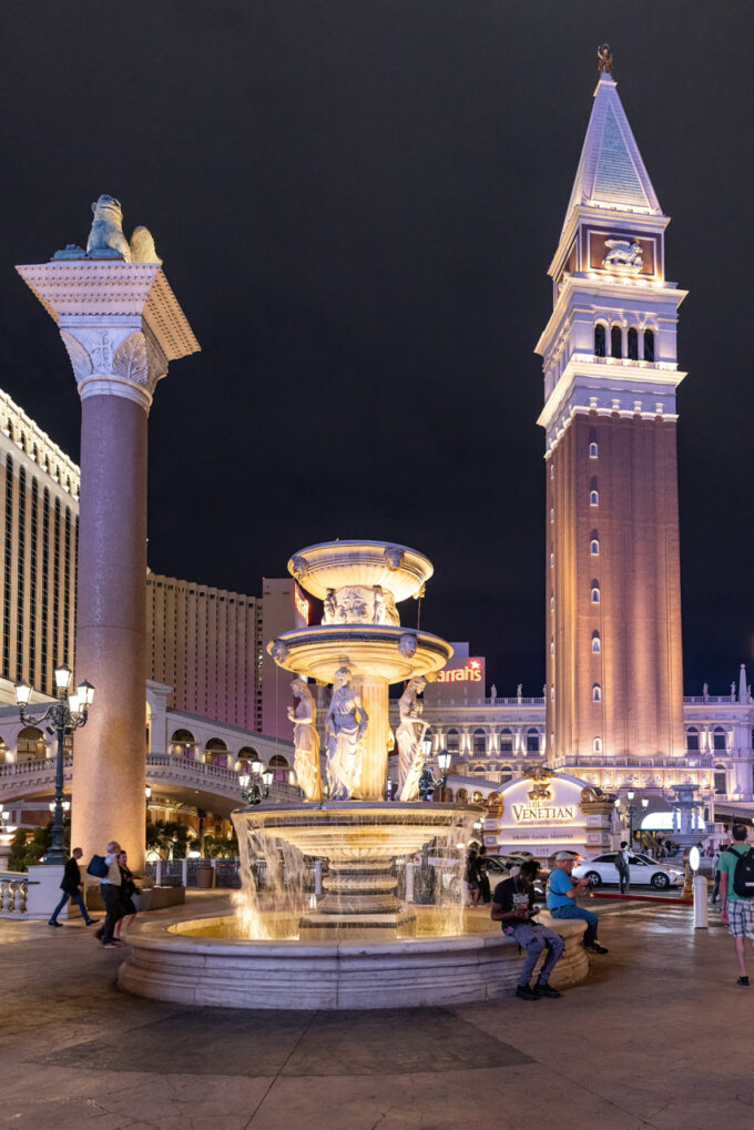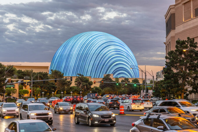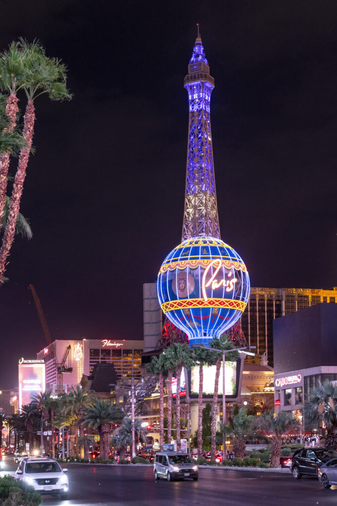 Zostawialiśmy samochód w hotelu i ruszyliśmy na słynny Las Vegas Strip – takie “amerykańskie Krupówki” tylko, że nieporównywalnie większe. Blisko siedem kilometrów deptaka, to kilkadziesiąt hoteli o najwyższym standardzie, kasyna, restauracje, sklepy z pamiątkami, czy sklepy najbardziej znanych amerykańskich marek. Ulica to festiwal kolorów. Nic do siebie nie pasuje. Właściciele obiektów prześcigają się, kto zrobi większą i bardziej widowiskową konstrukcję. Idąc głównym deptakiem mijamy hotel, którego charakterystyczną cechą jest wierna kopia wieży z Placu św. Marka oraz słynne mosty Weneckie, po drugiej stronie natomiast mamy bujną zieleń z wodospadami hotelu Mirage. Są też dwa okręty, rzymskie rzeźby, kolumny i łuki, później wieża Eiffel’a z balonem braci Montgolifier, aż dochodzi się do części, gdzie nad ulicą dominuje Statua Wolności i Empire State Building charakterystyczne dla Nowego Yorku. Jest nawet Sfinks i piramida! Fantazja amerykanów nie zna granic, a Las Vegas Strip to w dalszym ciągu plac budowy. Część starych obiektów jest wyburzana i zastępowana nowymi. Powstaje nowy stadion sportowy. Najnowszy obiekt to tak zwana Sfera. Usytuowana jest trochę z tyłu i żeby do niej dość trzeba odbić nieco z głównej ulicy, ale warto podejść, bo robi niesamowite wrażenie. Jest ogromna i na dodatek w całości wykonana ze świateł LED, co czyni ją obecnie największym ekranem na świecie.