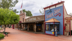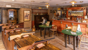 Najważniejszym miejscem w Trail Dust Town jest restauracja Pinnacle Peak Steakhouse. To między innymi dzięki niej miasteczko co wieczór wypełnia się gośćmi. Lokalne przewodniki informują, że to tutaj można zjeść najlepszego steka w Tucson, który wycinany jest z polędwicy i grillowany na otwartym ogniu, z drewna mesquite. Postanowiliśmy zjeść obiad właśnie tutaj. Już na wejściu przywitała nas przyjazna atmosfera tego lokalu. Wszystko w klimacie starego kowbojskiego baru, wykończone drewnem i ciepłym światłem.