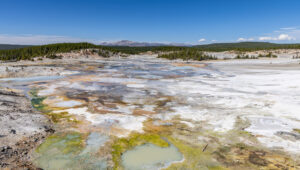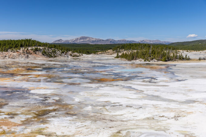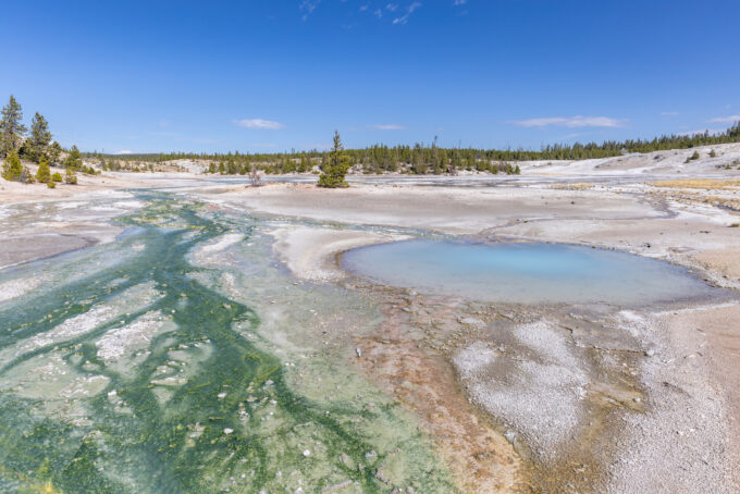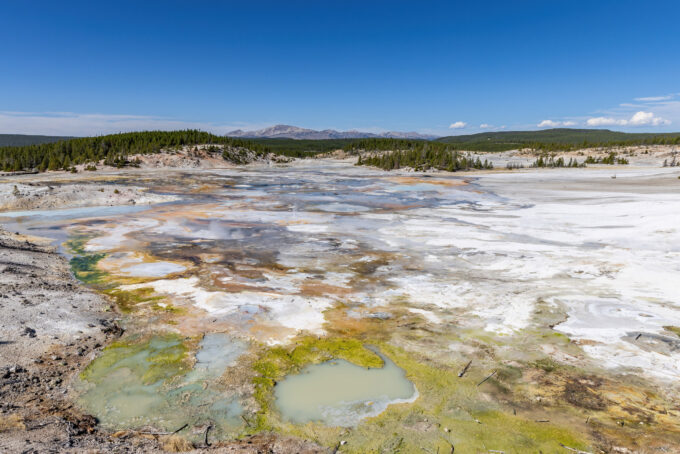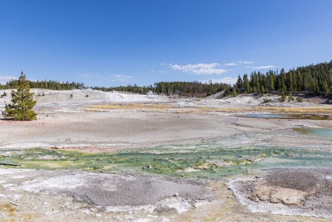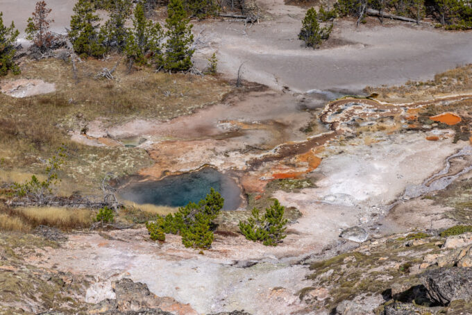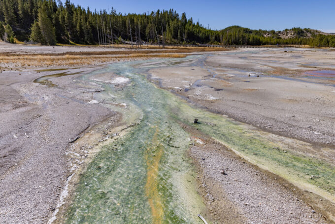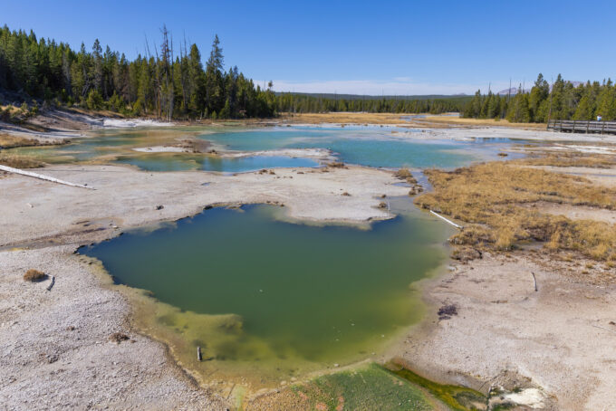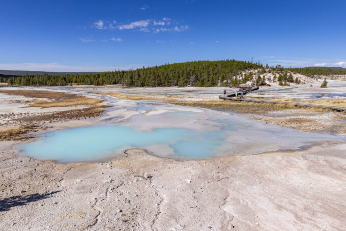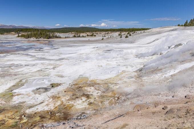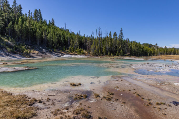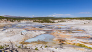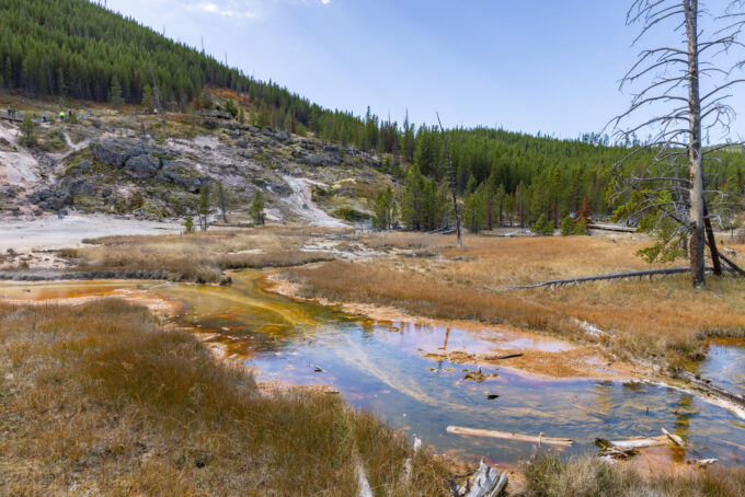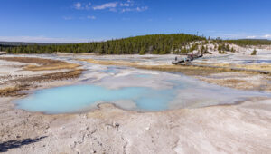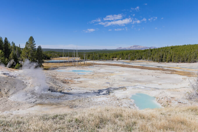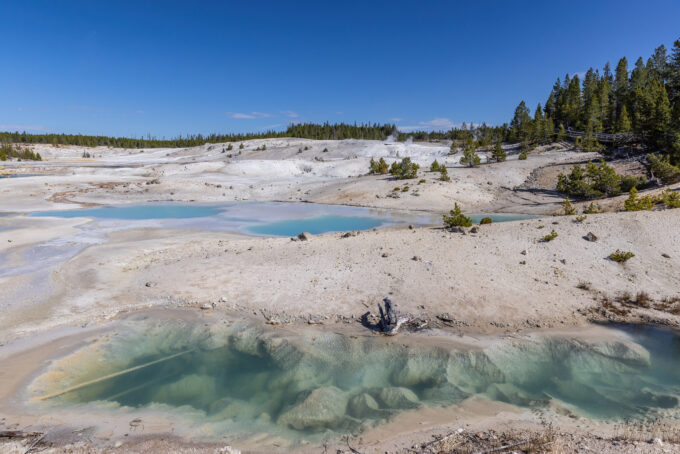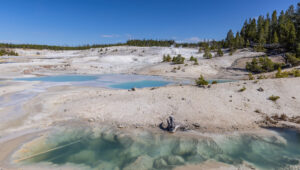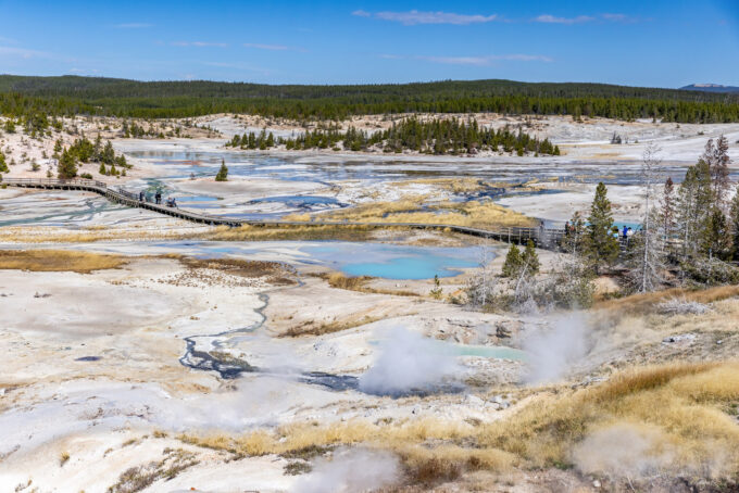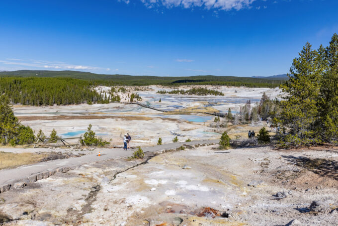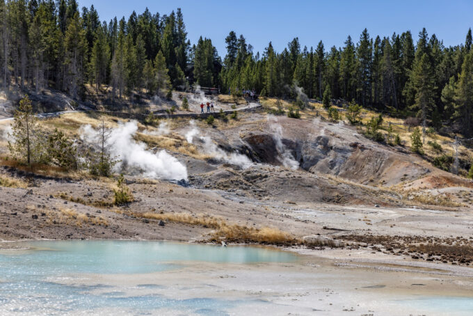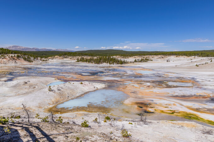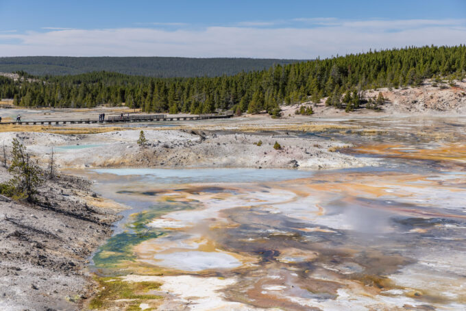 W kolejnym miejscu trzeba zostawić samochodu na nieco dłużej, co zresztą widać, bo ciężko znaleźć miejsce parkingowe i jest tutaj sporo ludzi. To dlatego, że w można tutaj zobaczyć ogromną ilość atrakcji z gejzerami włącznie. Norris Porcelain Basin szkli się przeróżnymi kolorami, które rzeczywiście mogą wyglądać jak błyszcząca porcelana, są błękitne gorące jeziorka i gejzery. Krajobraz w tym miejscu jest dość ciekawy, niespotykany i totalnie kolorowy. Spędziliśmy tutaj sporo czasu a i tak mam wrażenie, że nie zobaczyliśmy wszystkiego.