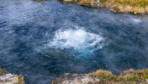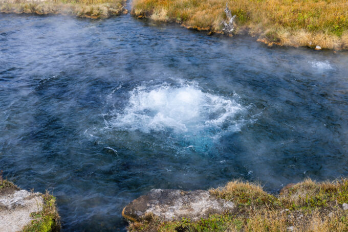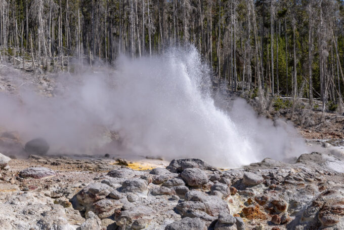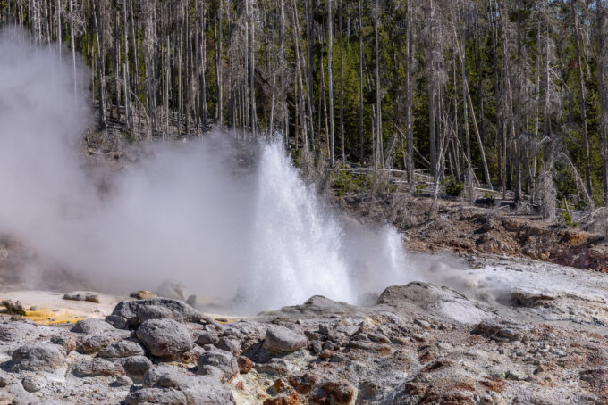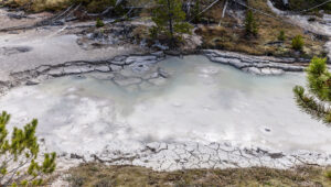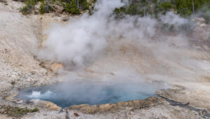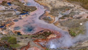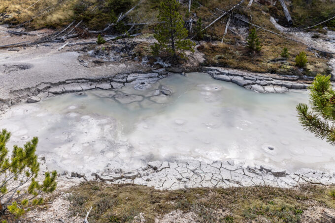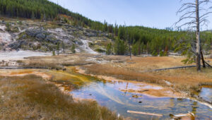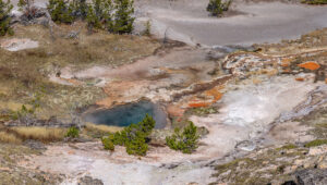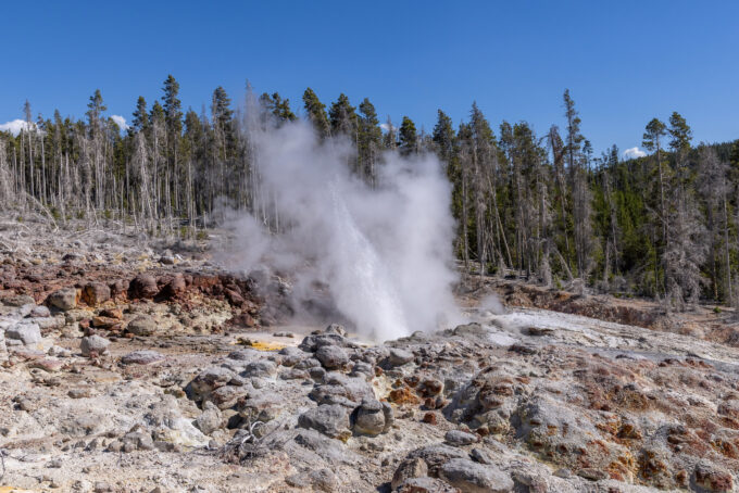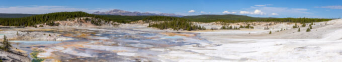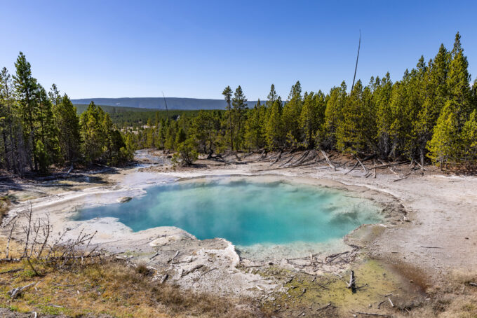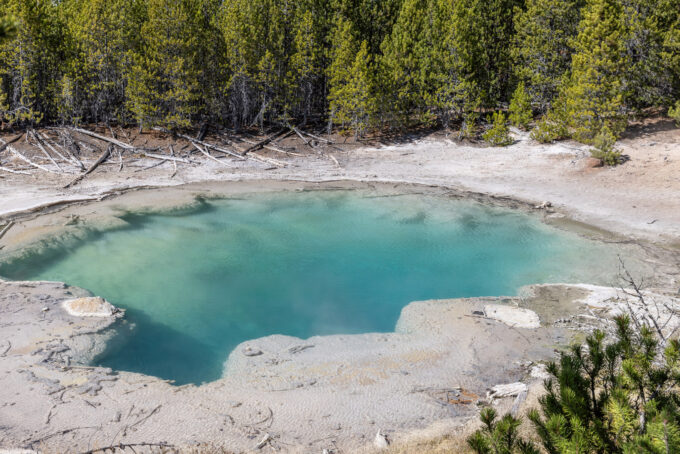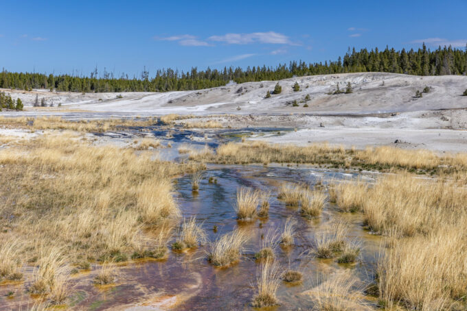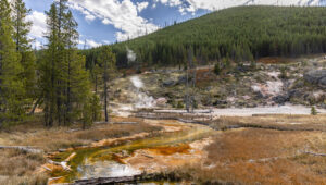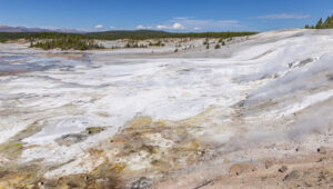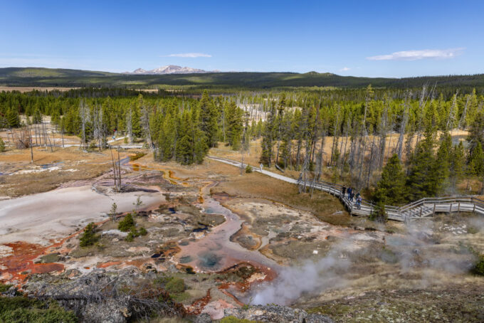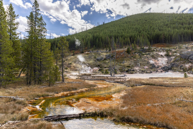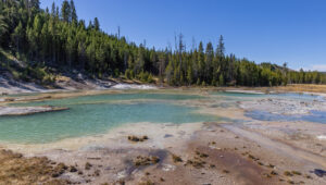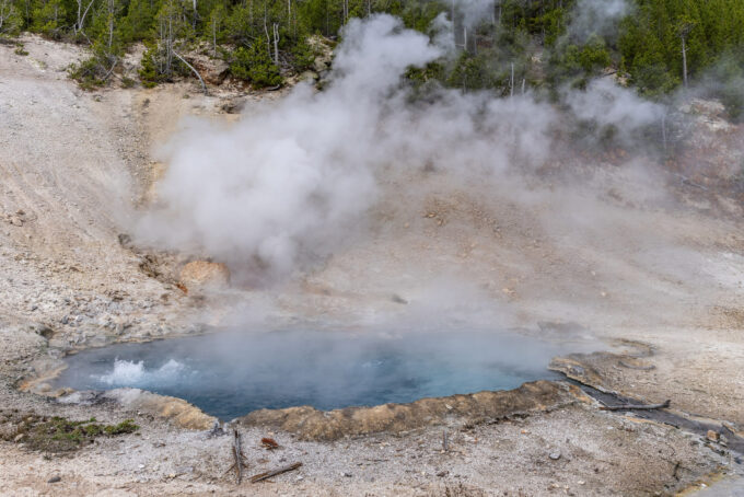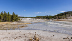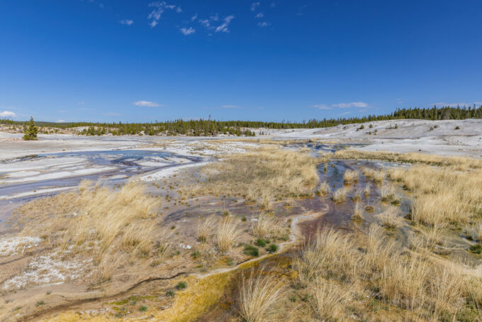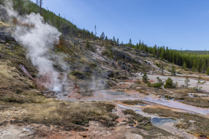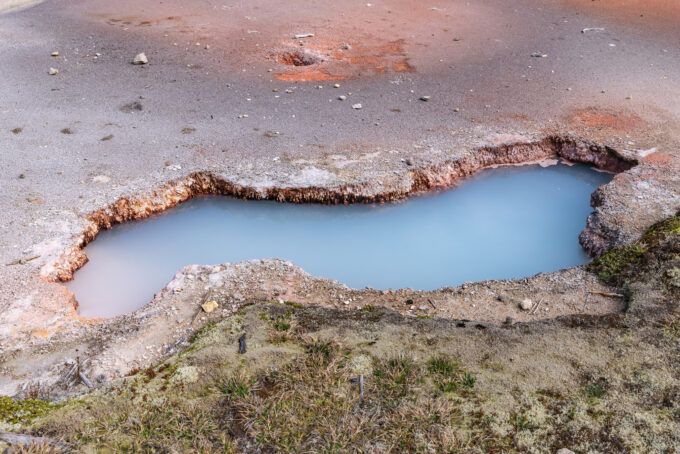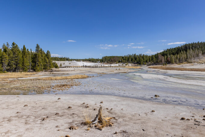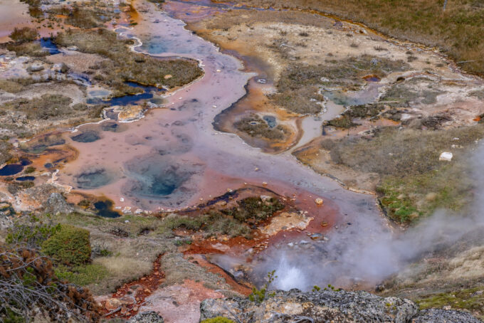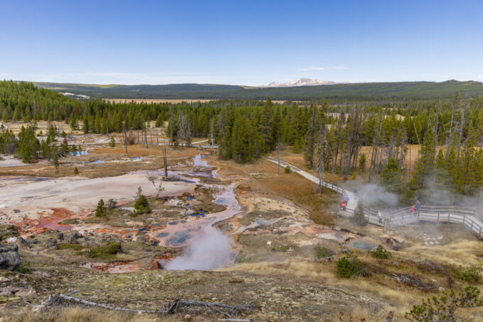 W kolejnym miejscu trzeba zostawić samochodu na nieco dłużej, co zresztą widać, bo ciężko znaleźć miejsce parkingowe i jest tutaj sporo ludzi. To dlatego, że w można tutaj zobaczyć ogromną ilość atrakcji z gejzerami włącznie. Norris Porcelain Basin szkli się przeróżnymi kolorami, które rzeczywiście mogą wyglądać jak błyszcząca porcelana, są błękitne gorące jeziorka i gejzery. Krajobraz w tym miejscu jest dość ciekawy, niespotykany i totalnie kolorowy. Spędziliśmy tutaj sporo czasu a i tak mam wrażenie, że nie zobaczyliśmy wszystkiego.