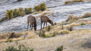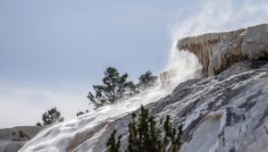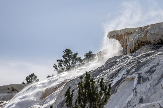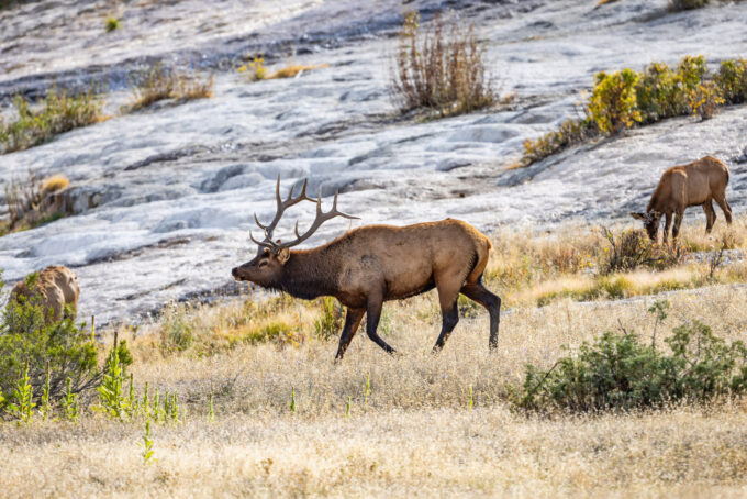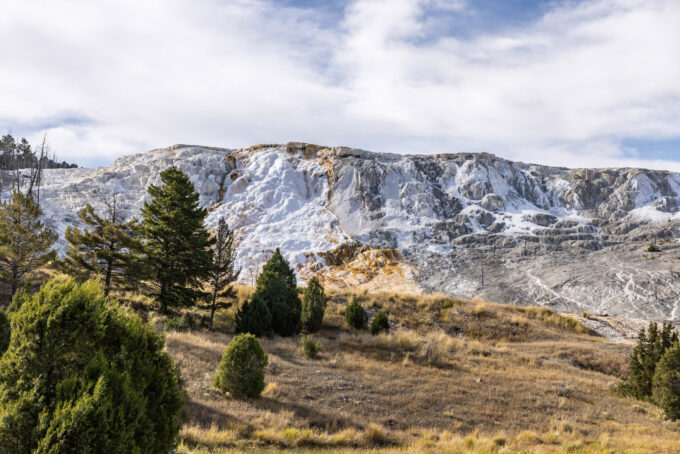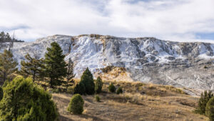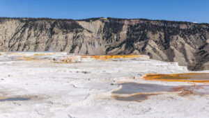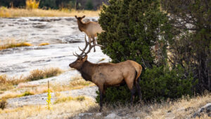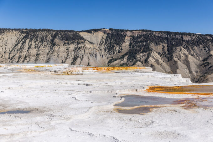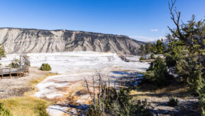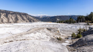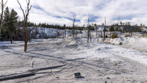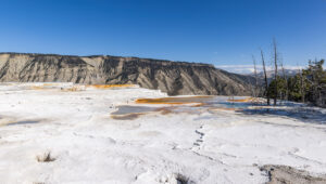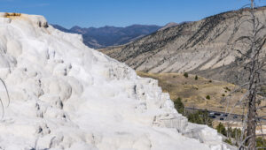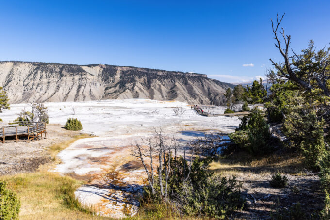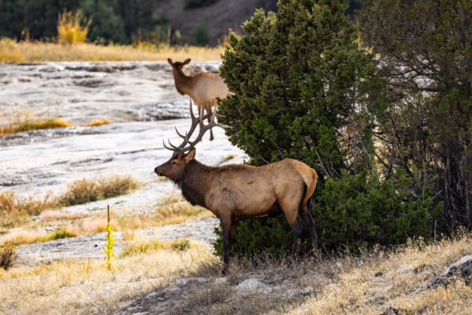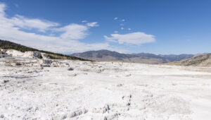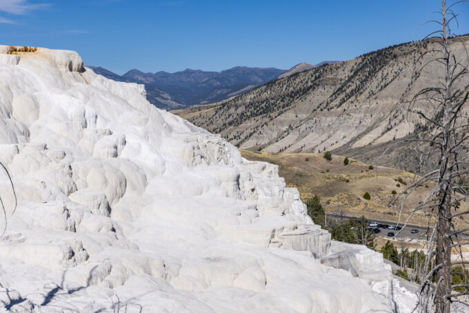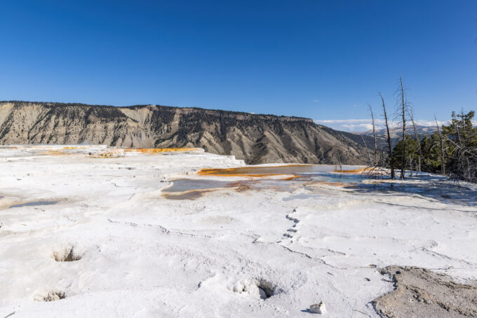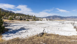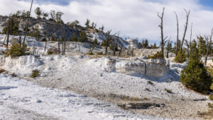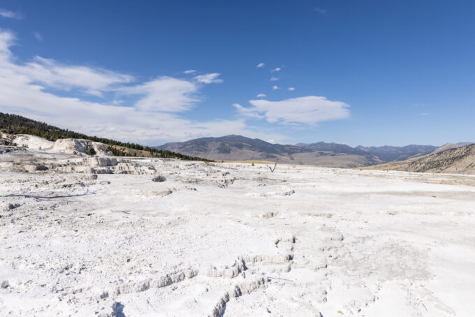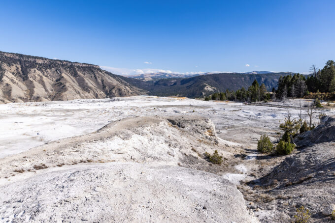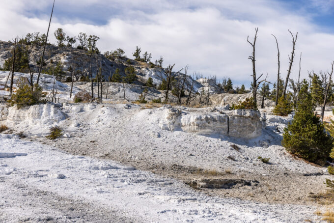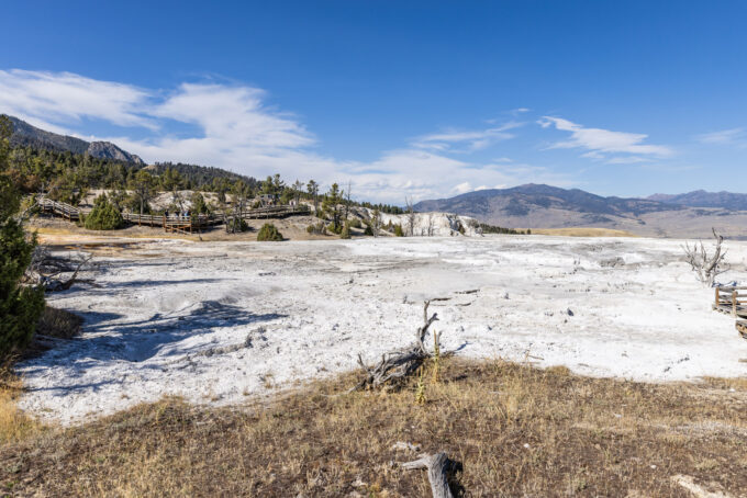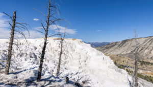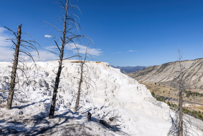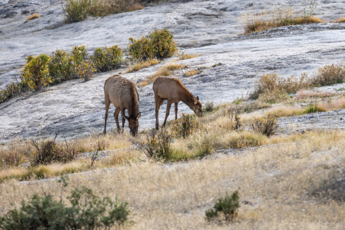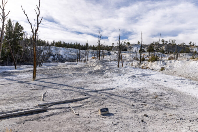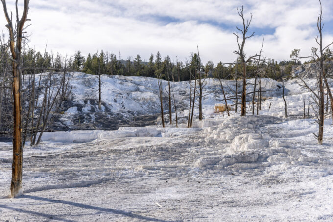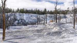 Ostatnim punktem przed miasteczkiem Mammoth Hot Springs były białe tarasy, które zostały utworzone z minerałów, które wypływały z gorących źródeł. Znowu zmienił się krajobraz, ale tym razem w śnieżnobiałą biel. Dookoła pełno martwych drzew. Prawdopodobnie zatruła je woda ze źródeł. A na samym dole przywitało nas małe stadko jeleni, które przez dość długą chwilę dały się fotografować, a później zniknęły w lesie.